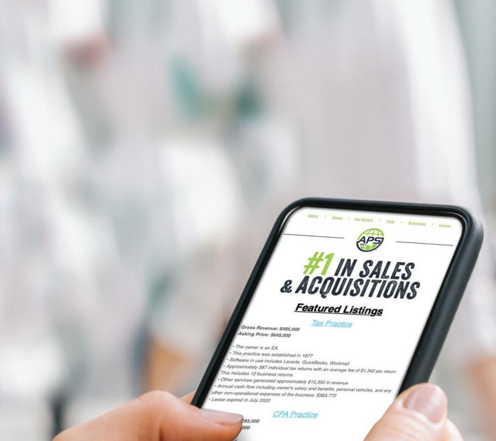 PRACTICES FOR SALE (gross revenues shown) W Central IL CPA $835K St Louis Metro Area Tax & Acctng $250K Jo iet EA Tax $84K; NW Chicago CPA $285K; E Central IL CPA $250K For practice deta ls call 1 800 397 0249 Or, visit us at www APS net to inquire about avai able oppor tunities and register for free email updates THINKING OF SELLING YOUR PRACTICE?