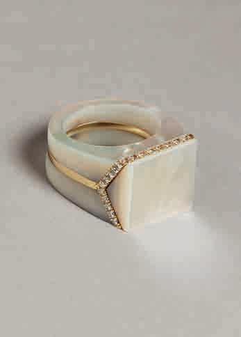 Designer Melanie Georgacopoulos’s jewels are not your grandmother’s pearls. Her innovative use of pearl and mother of pearl results in contemporary, sculptural pieces, made using an array of techniques such as experimental carving. V signet ring, recycled 18ct yellow gold with white mother of pearl and white diamonds, £5,200, melaniegeorgacopoulos.com