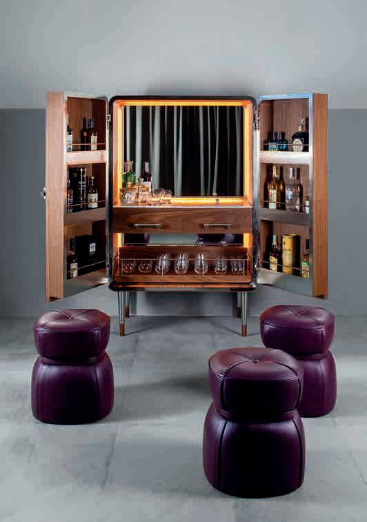 Make cocktails centre stage with this soigne cocktail cabinet from O cine Gullo. A collaboration with Pierattelli Architetture, it fuses the soft, sleek tones of warm- grained Canaletto walnut with luxurious Carrara marble. A nickel finish brings the piece together. Both attractive and utilitarian, it meets all the requirements of the stylish drinker — from a pull-out shelf covered in eco-leather for storing glasses to two drawers designed to contain utensils and ice trays. Soft backlighting also adds a theatrical e ect. Unveiled at Milan Design Week 2025, it is a one-o showstopper. POA, o cinegullo.com