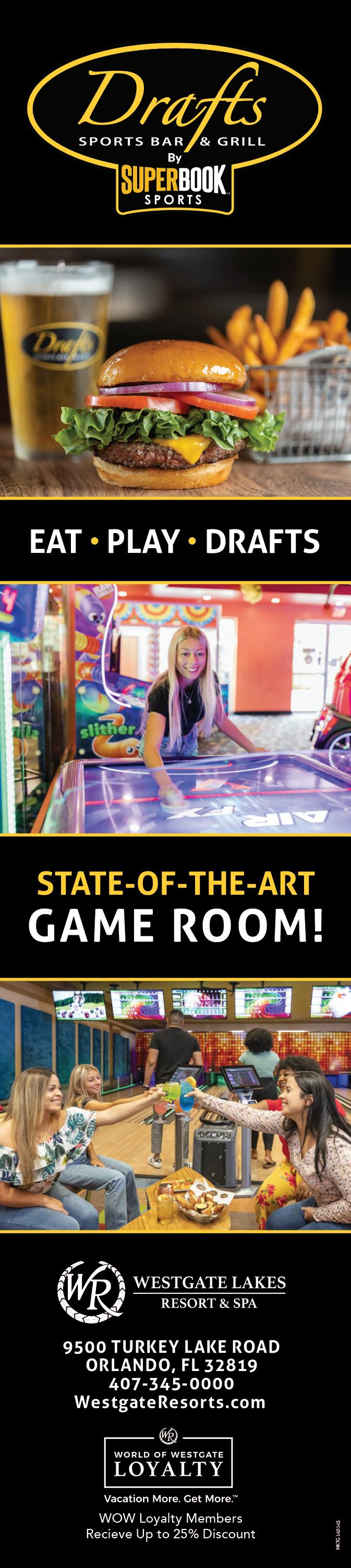 Take a break from the sunshine and unwind at Drafts Sports Bar & Grill. From exciting entertainment on several HDTVs, to a state-ofthe-art Mission Control Game Room and six lanes of bowling, there’s something for the whole family to enjoy.