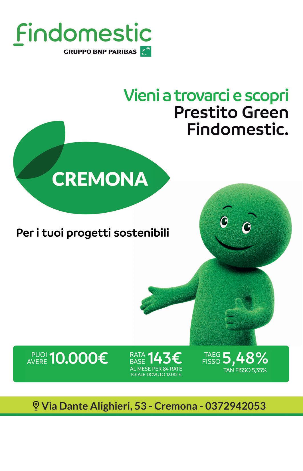 Messaggio pubblicitario con finalità promozionale. Per tutte le condizioni economiche e contrattuali fare riferimento alle Informazioni Europee di Base sul Credito ai Consumatori (IEBCC). L'offerta speciale Prestito Green è erogabile esclusivamente per progetti che promuovono il risparmio energetico, l'energia rinnovabile e l'efficientamento della casa, previa presentazione di una documentazione che certifichi la finalità del prestito richiesto da parte del cliente. Esempio di Prestito Personale: €10.000, rata base €143 al mese per 84 rate. Tan fisso 5,35%. Taeg fisso 5,48%. Costi accessori dell'offerta azzerati. Importo totale del credito €10.000. Importo totale dovuto dal consumatore €12.012. Taeg massimo applicabile, in funzione del cambio rata e salto rata 5,50%. Offerta valida dal 01/05/2021 al 28/02/2023. Salvo approvazione Findomestic Banca S.p.A. Agente per Findomestic Banca S.p.A. Marca Finanziamenti srl iscritto nell’elenco degli agenti in attività finanziaria ex art. 128quater, D. Lgs. 385/93. Agente in attività finanziaria legato da rapporti contrattuali ad uno o più intermediari, operante entro i limiti del mandato conferito da Findomestic Banca S.p.A.