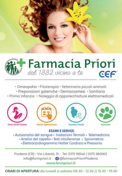 SIAMO PRESENTI ANCHE A: CASALMAGGIORE (CR) c/o Poliambulatorio LE CO.ME.TE. - Via Don Paolo Antonini, 12 • PIADENA (CR) c/o Poliambulatorio LE CO.ME.TE. - Via Platina, 46 • GADESCO PIEVE DELMONA (CR) c/o Centro Tutela Salute MED - Centro Comm. Iper Cremona 2, Via Enrico Berlinguer • PIZZIGHETTONE (CR) c/o Farmacia Bonfanti - Via Castello, 1 • ORZINUOVI (BS) c/o Farmacia Adua - Via Bracesco, 3b • SORESINA c/o Farmacia Solzi - Via Barbò, 40 • CASALMORANO (CR) c/o Centro Futuro Salute - Piazza IV Novembre, 7/8 • RIVOLTA D’ADDA (CR) c/o Farmacia Ferrario - Piazza Vittorio Emanuele II, 33