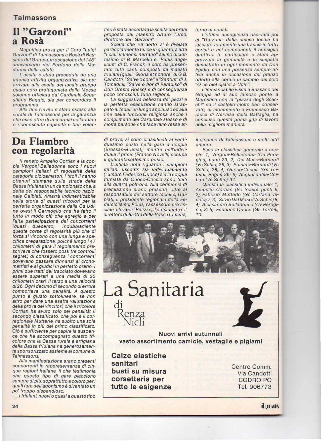 analizzato in modo più specifico la situazione della nostra Regione. "La diminuzione dell'inflaz i one - ha affermato - è un primo segno di ripresa, un chiodo ben solido per chi voglia effettuare la scalata della ripresa economi· ca". Importante, tra l'altr o, pure la dichiarazione che in Friuli gli incentivi alle attività economiche ed Imprenditoriali sono parecchi e, comunque, superiori a quelli di qualsiasi altra regione italiana. E' seguito Il dibattito che ha visto l'i ntervento di politici, di operatori economici, di cittadini. Erano presenti tra gli altri il consigliere provinciale della D.C. Moretti, gli assessori comunali Massa, Valoppi e Sorame!, il capogruppo della Dc Di Le· narda, il presidente mandamentale dell'Unione Artigiani Zanin. Tra gli i m· prend itori e gli operatori economici sono stati notati D'Angela, Morettuzzo, Fabello, Tomada, Scolari, Tanchis, §" Petri, Martin, De nna, Romanzin e 0 Battiston Al term in e della lunga dia; scussione Il segretario del comi t ato r. comuna le ha ringra ziato re latori e par- I! tecipantl , promettendo ulteriori inl relatorl al convegno: o n.