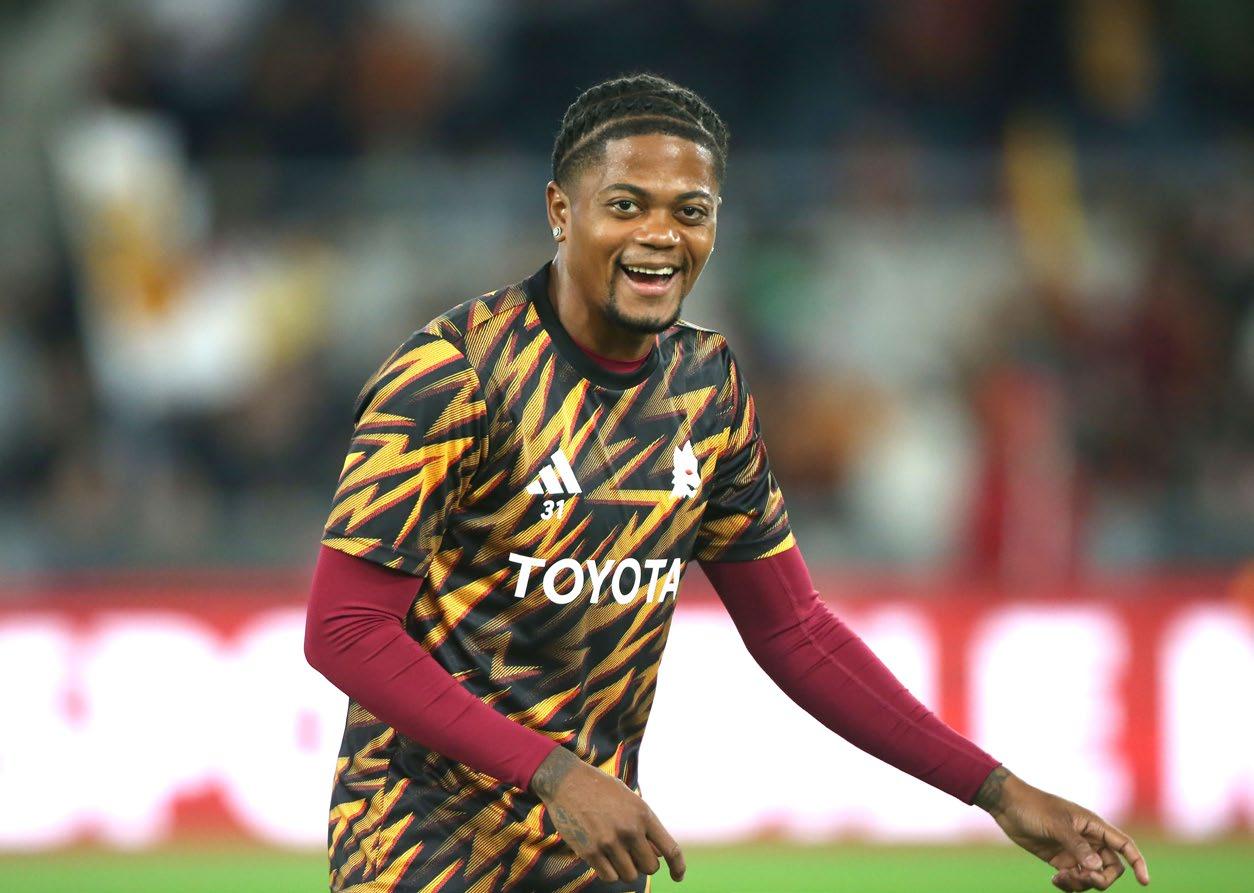 Leon Bailey (28 anni) durante il riscaldamento di Roma-Inter del 18 ottobre 2025, sera del suo debutto in maglia romanista MANCINI