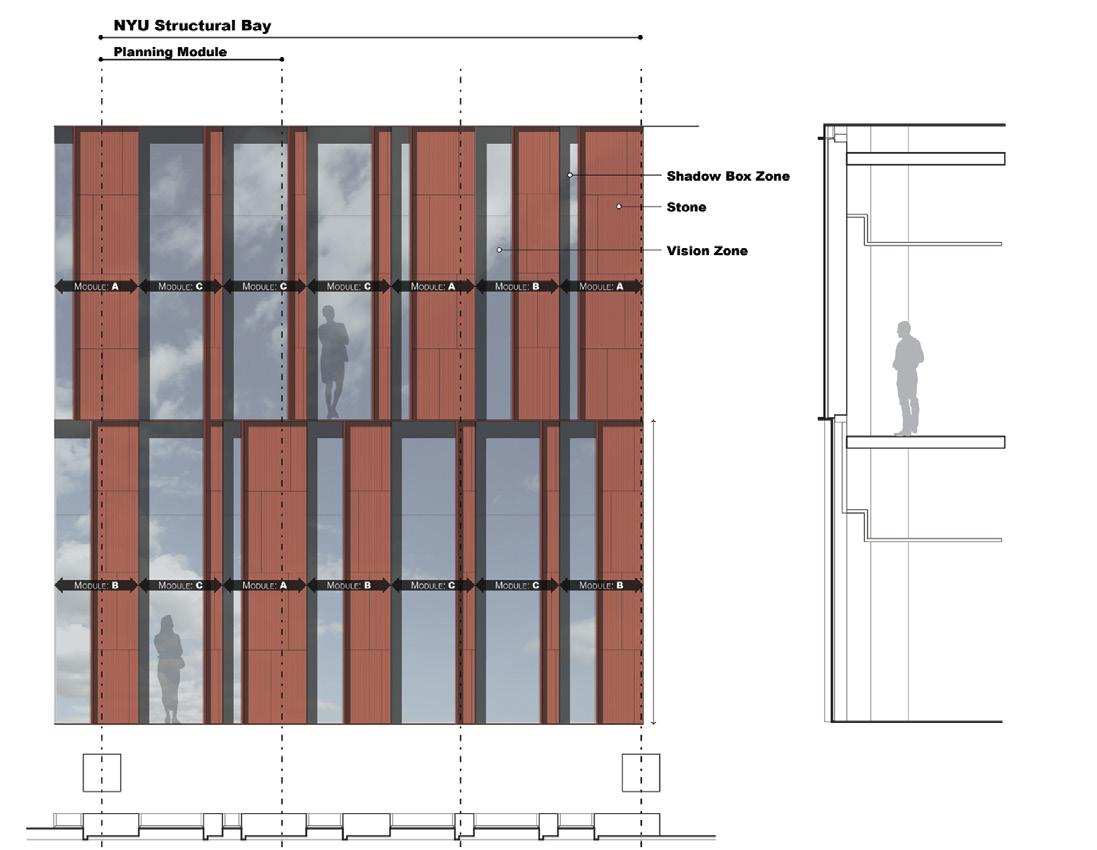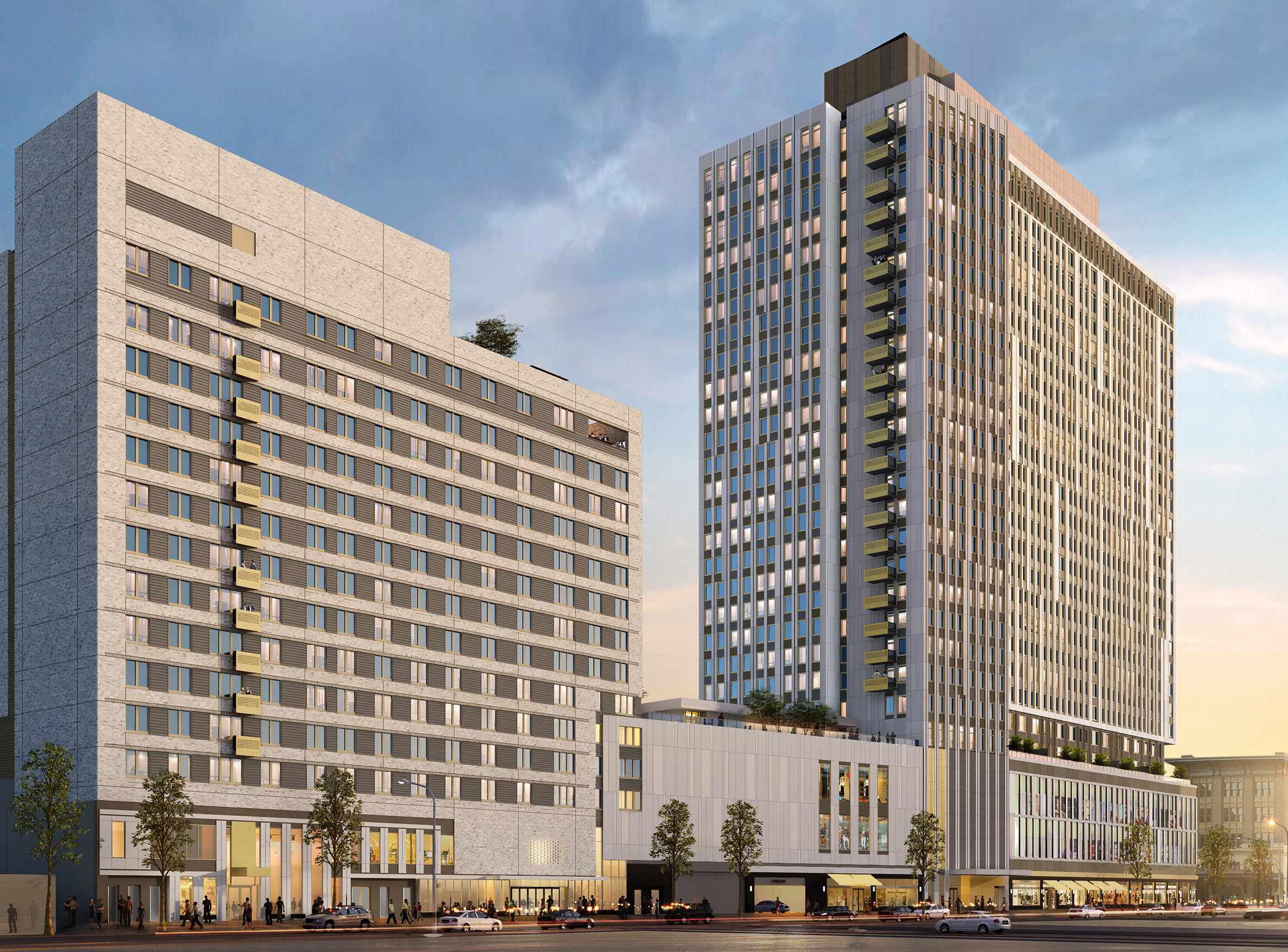 The first building in the development, a 600,000-square-foot, 28-story high-rise, contains 539 units and rises from a three-story retail and parking garage podium. The façade animates the urban streetscape with a vertical composition of light-colored, precast panels. The second, shorter building, a 170,000-square-foot, 14-story mid-rise, contains 130 units and will incorporate community facility space. Its façade is a horizontal composition of variegated brick and strip windows. Both buildings have a mix of studios to three-bedroom apartments. The project features private garden apartments at the setback above the podium, and tenant amenity spaces atop the podium and on the rooftops of both buildings.
