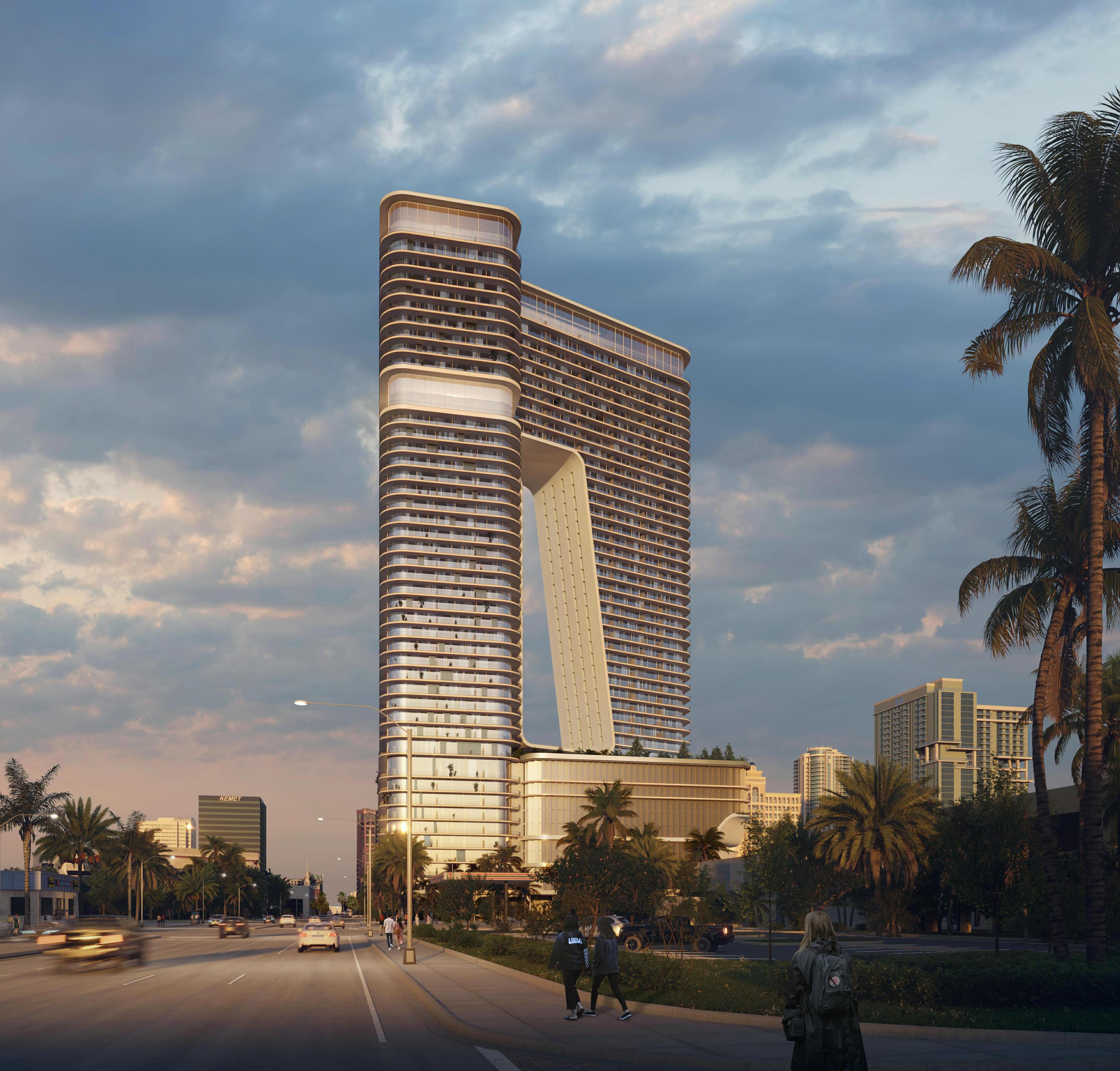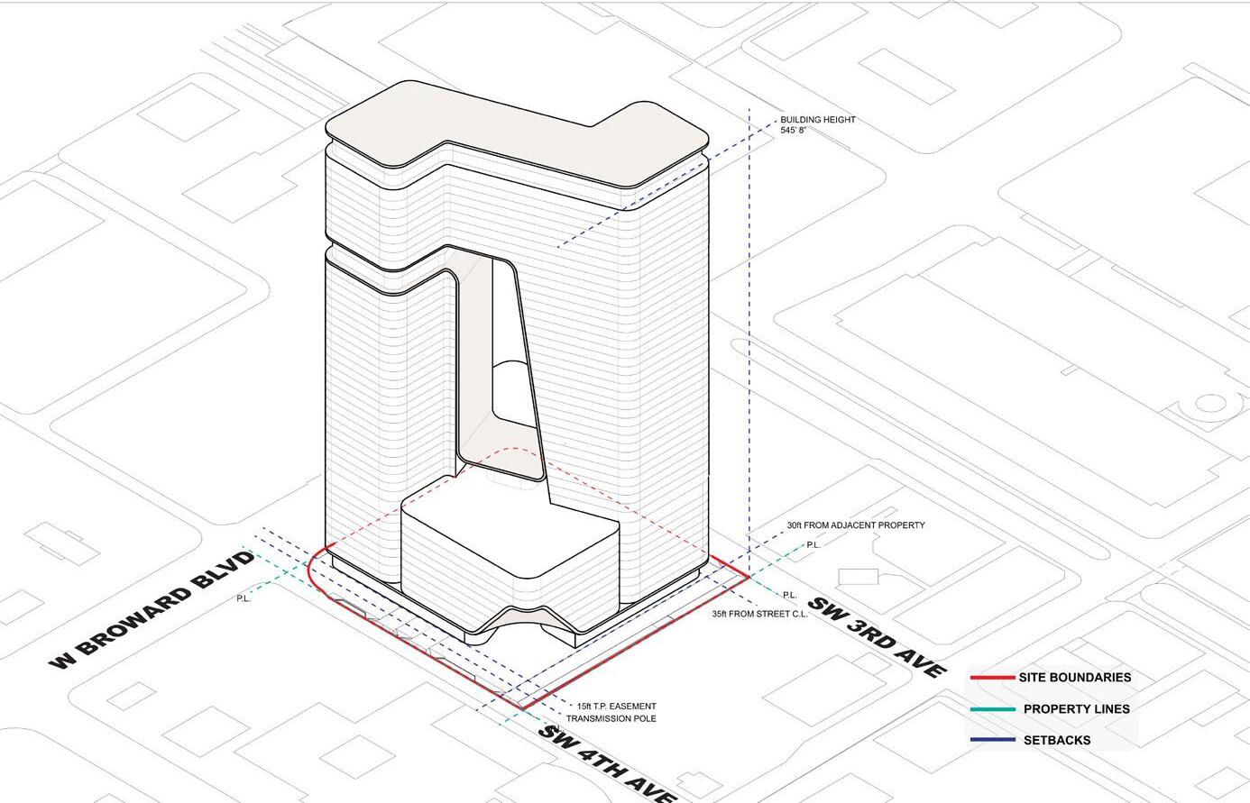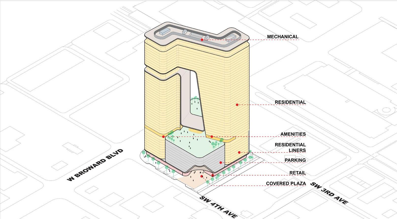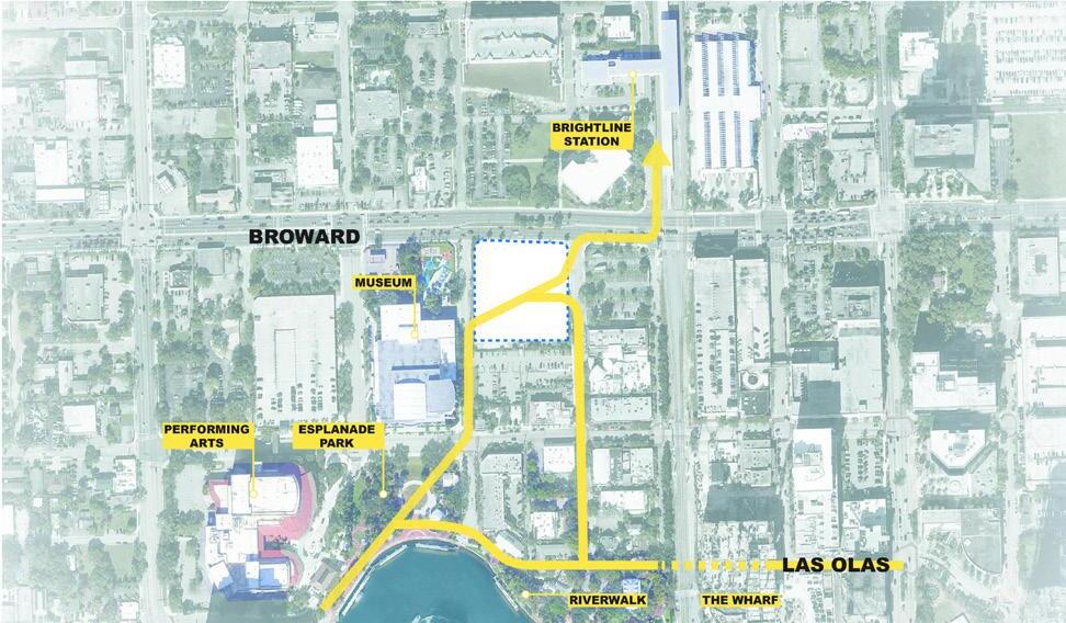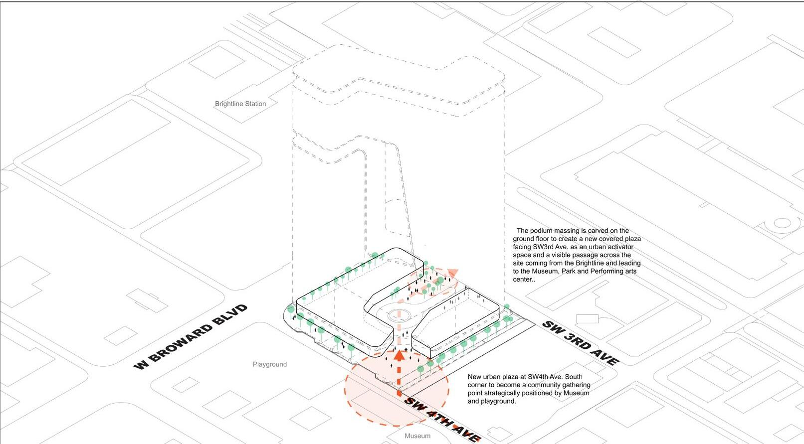 The unique bridged massing of the towers creates a focal point for visitors and residents and adds an iconic new element to the growing skyline. The site is located at an important junction between major transportation hubs, civic and cultural institutions, and commercial attractions. To the northeast are the transportation hubs of the Brightline station and the Broward Central Bus Terminal. To the northeast and southwest are the civic and cultural landmarks including the future Joint Governmental Campus, the Museum of Discovery and Science, the Broward Center for the Performing Arts, and Esplanade Park. To the east is the vibrant commercial street of Las Olas Boulevard.