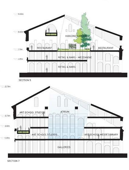 tural sites and tourist attractions. Conceived in 1719, it became a military port in 1721 and remained in military possession, closed to the general public, for 300 years. We have imagined this site a microcosm of wider urban context a cultural “city within the city” that sponsors a vast range of public spaces and programs, from the visual and performing arts, to new technologies, to education, to markets and a hotel. Rather than adding new architectural statements, however, we have worked primarily through subtraction to carve from the historic warehouses their amazing potential for public and cultural activity, retaining as much public outdoor space as possible.