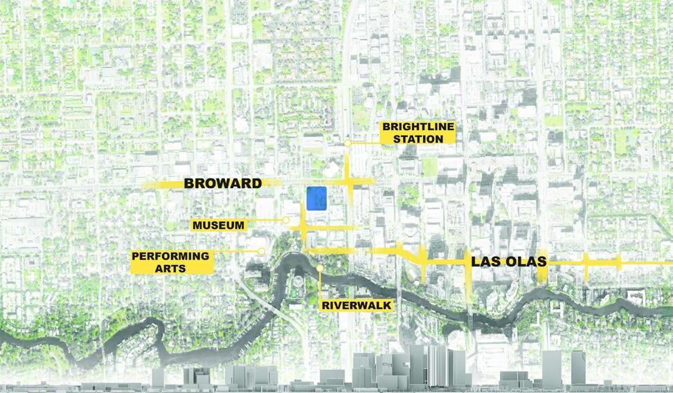 The unique bridged massing of the towers creates a focal point for visitors and residents and adds an iconic new element to the growing skyline. The site is located at an important junction between major transportation hubs, civic and cultural institutions, and commercial attractions. To the northeast are the transportation hubs of the Brightline station and the Broward Central Bus Terminal. To the northeast and southwest are the civic and cultural landmarks including the future Joint Governmental Campus, the Museum of Discovery and Science, the Broward Center for the Performing Arts, and Esplanade Park. To the east is the vibrant commercial street of Las Olas Boulevard.