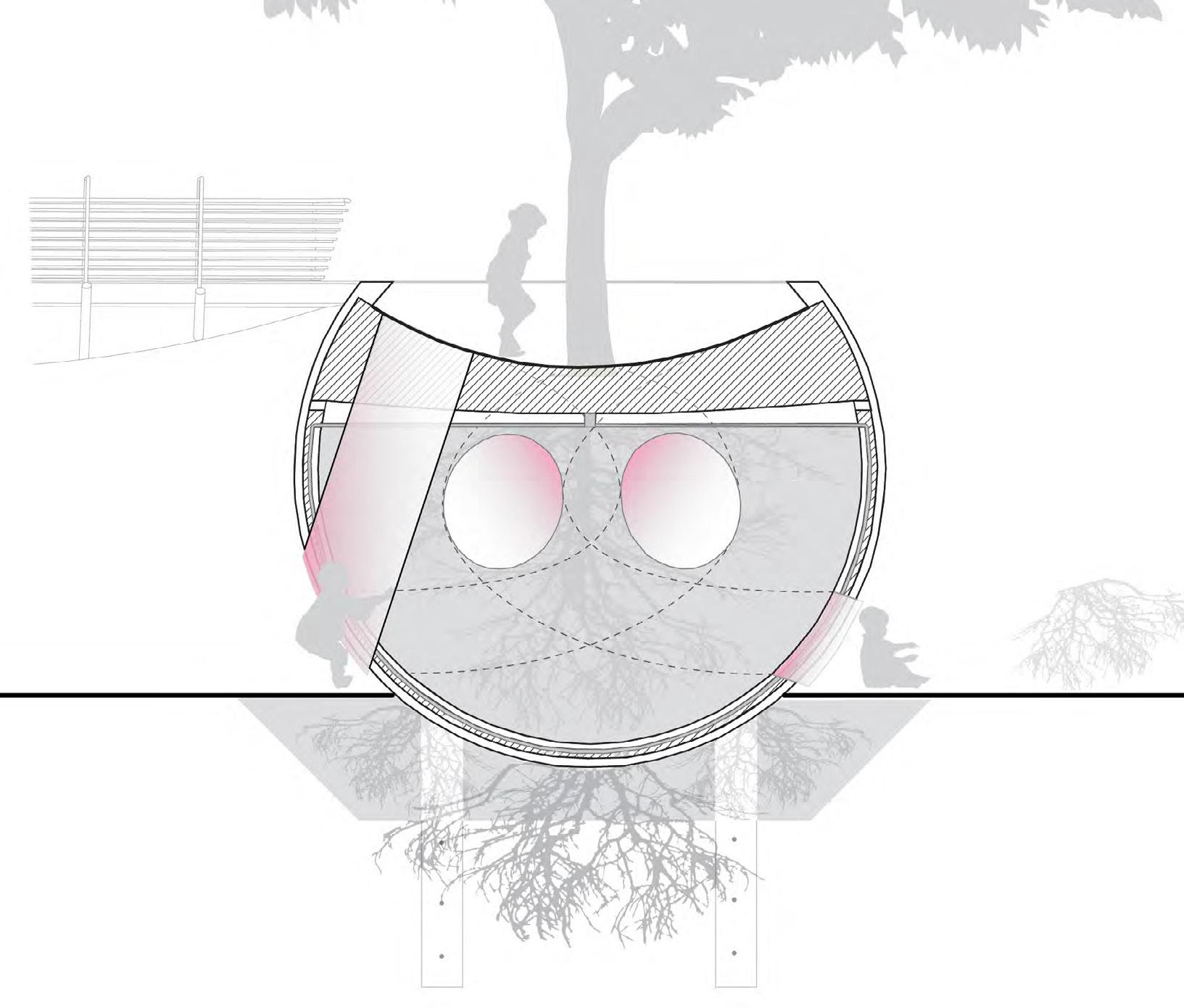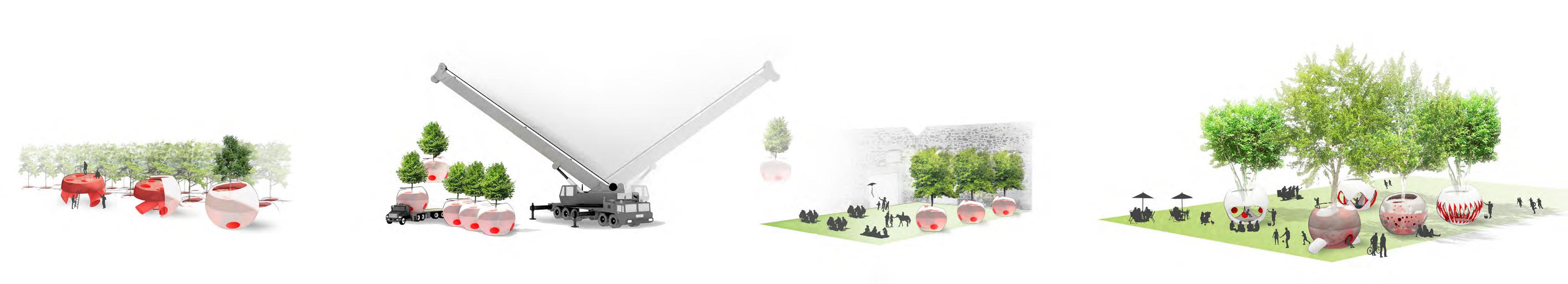 Plant-A-BALL PARKS creates a series of play structures that not only generate a sense of place, but also house a synergy of interventions at the site and city scale. The sphere is ideal for capturing the imagination of children as well as providing a versatile shape in which to encapsulate the proposed interior play program. A flexible primitive volume that can be manipulated into other platforms of play. The orbs height and scale provide adequate housing for the planting compartments above, as the shell’s design enables the trees and plantings space to grow through the membrane and stabilize itself with the existing sub-grade.