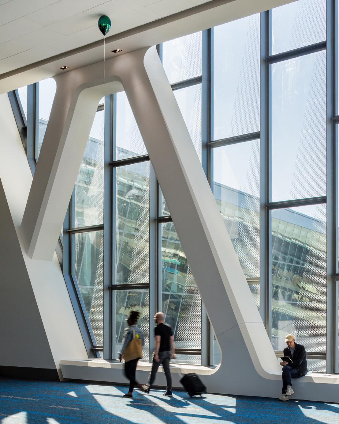 LaGuardia Airport’s new Terminal B symbolizes the top-tobottom transformation of one of the nation’s highest-profile airports.The transparent, fluid design of the 850,000-sq.ft. Arrivals and Departures Hall (headhouse) celebrates movement while conveying a strong civic presence in a city known for its remarkable architecture.