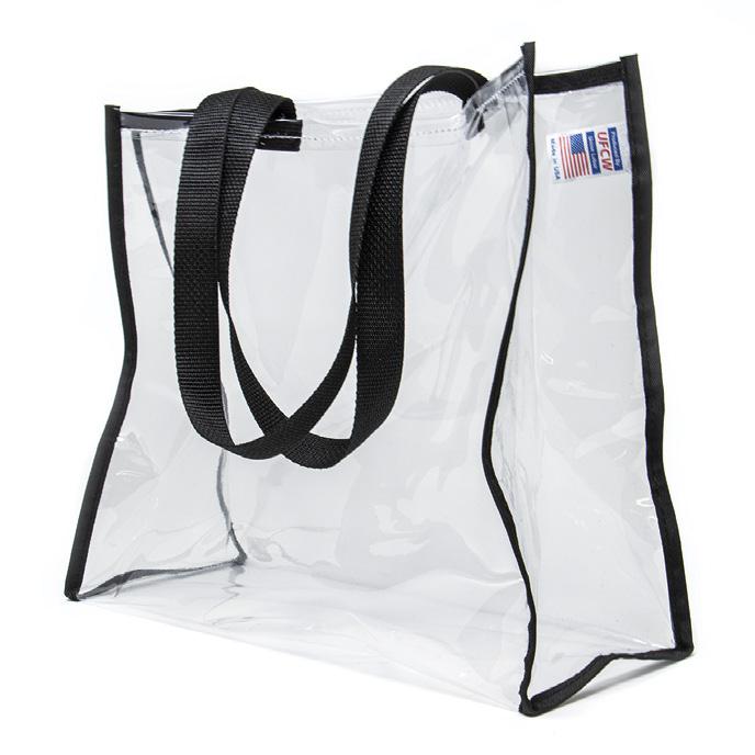 This clear tote is perfect for any event. Made from durable PVC materials with comfortable 20” handles for easy transport. Features matching trim colors. 12” x 12” x 6” (W/H/D). Min. 100.
