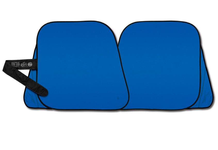 Easy to use, universal fit car visor. Built in wrap around strap with clear business card sleeve. Colored front, silver reflective material with black backside and sides. Available in five colors. Min. 50