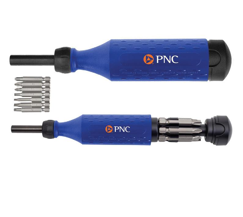 Loaded with 7 durable industrial grade steel bits at the end of tool. Includes Slot bit 6, Slot bit 4, Phillips bit 1, 2 & 3, Torx bit 15, Square bit 2 and Hex Nut Drive. Many colors avaiable, and can mix and match collar, handle and cap color. Min. 100.