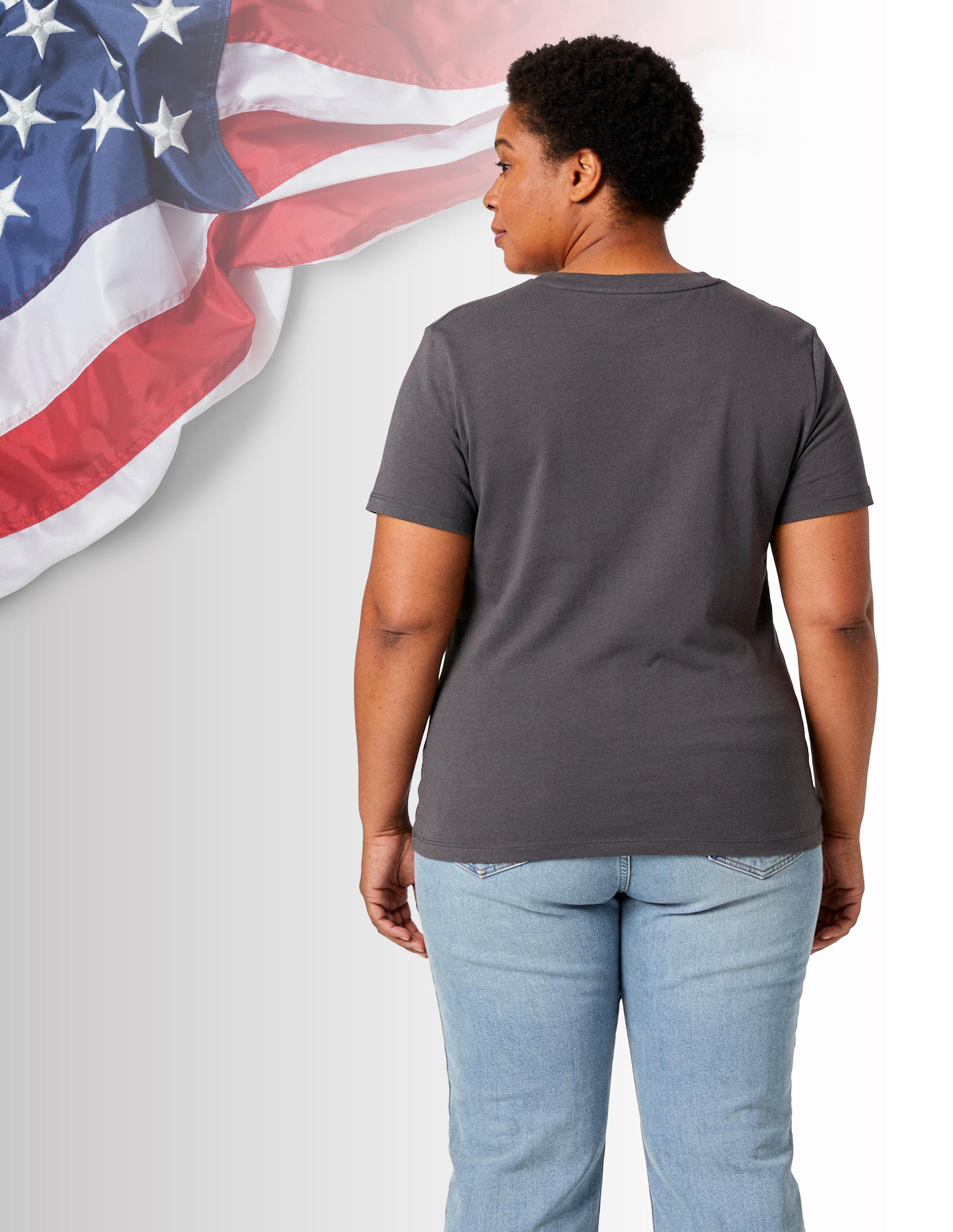 Every Dignity Apparel t-shirt features a tagless union stamp neck label and the Union-Made Dignity Apparel hem tag.