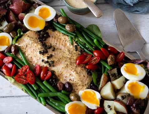 Enjoy spring on a plate with this deliciously fun riff on a traditional tuna niçoise, which includes a lovely slab of salmon baked with a phenomenal mustard dressing. Place it over mixed greens