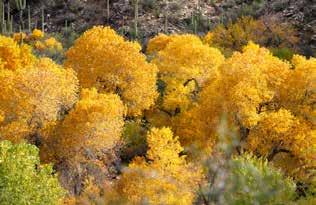 Gracing riparian areas from 2,000 to 6,000 feet, Arizona sycamores display a range of golden yellow to orange hues. Their colors peak from late October to mid-November, illuminating stream banks and canyon bottoms.