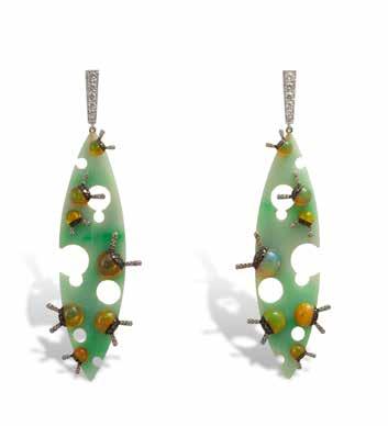 sculptural figure of one of Japan’s Seven Lucky Gods, carved from orange opal with paraiba tourmalines and diamonds — that won both MJSA Design Excellence and Laser Distinction awards simultaneously. Or the Buddha earrings: small engraved sculptures in pink opal with pink tourmaline drops that collectors wear as conversation pieces.