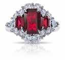 Emerald cut ruby (3.01 ctw) set with two emerald cut rubies (.82 ctw) and 14 diamonds (1.77 ctw) set in platinum scalloped halo ring