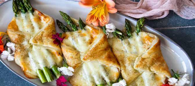 What better way is there to welcome spring than with these delicious asparagus prosciutto wraps? They are stunning to look at and highlight a beautiful spring vegetable — asparagus. They are easy to make but look like you've worked all day on them. I love the combination of white cheddar cheese, prosciutto and asparagus, all wrapped together in puff pastry then glazed with a honey-tinged egg wash. Add some edible flowers to your platter to make it pop!