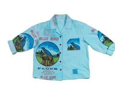 Toni Williams (Northern Arapaho), Shirt, c. 2015. Blue Bird Flour bag cloth, Rit Dye. Collection of Kathy and Bill Howard.