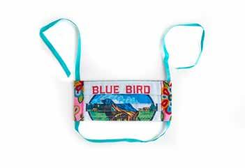 Ginger Sykes Torres (Diné) and Sherry Denipah Sykes (Diné), Face mask, 2020. Blue Bird Flour bag cloth, printed pattern fabric, elastic. Gift of the artists, 4968-3.
