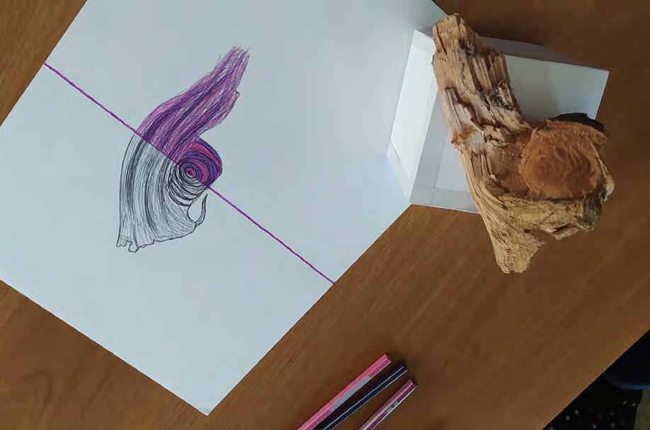 Una sorta di lezione-incantesimo. Si, ecco quello che con le classi prime abbiamo cercato di vivere, per restituire un momento di “vita” a delle schegge di frassino destinate al fuoco. Quindi, eccoci al lavoro prima che questa legna proseguisse il suo viaggio verso la cenere, e l’aver immortalato punti, linee e superfici lignee, ha permesso ai nostri occhi, ancora una volta, di crescere, ai nostri polsi di conquistare una maggiore flessibilità, alle nostre mani di migliorare le diverse pressioni sul foglio, al nostro entusiasmo di stupirci ancora una volta davanti all’“insolito”. Gli alunni, che come sappiamo, cominciano ad avere a che fare in modo piuttosto regolare con i filtri dei dispositivi digitali di ultima generazione, hanno provato a riproporre come copia dal vero il loro frammento di legno a penna nera ma in più, hanno potuto creare per metà della forma complessiva, un “filtro” a pastello scegliendo in totale libertà un cromatismo che potesse completare così, il loro processo di utilizzo dell’immaginazione. Vero e immaginario, natura e disegno, osservazione e tratto. Insomma, un’esperienza completa, variegata e che ci ha regalato un momento didattico di grande soddisfazione.