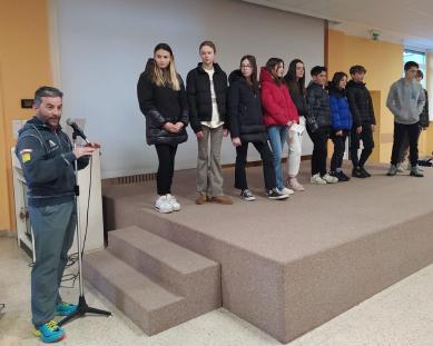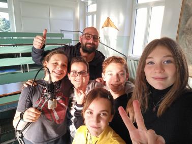 La 1^C durante la presentazione di MitiCast ai compagni di tutta la Secondaria durante un “Buongiorno”