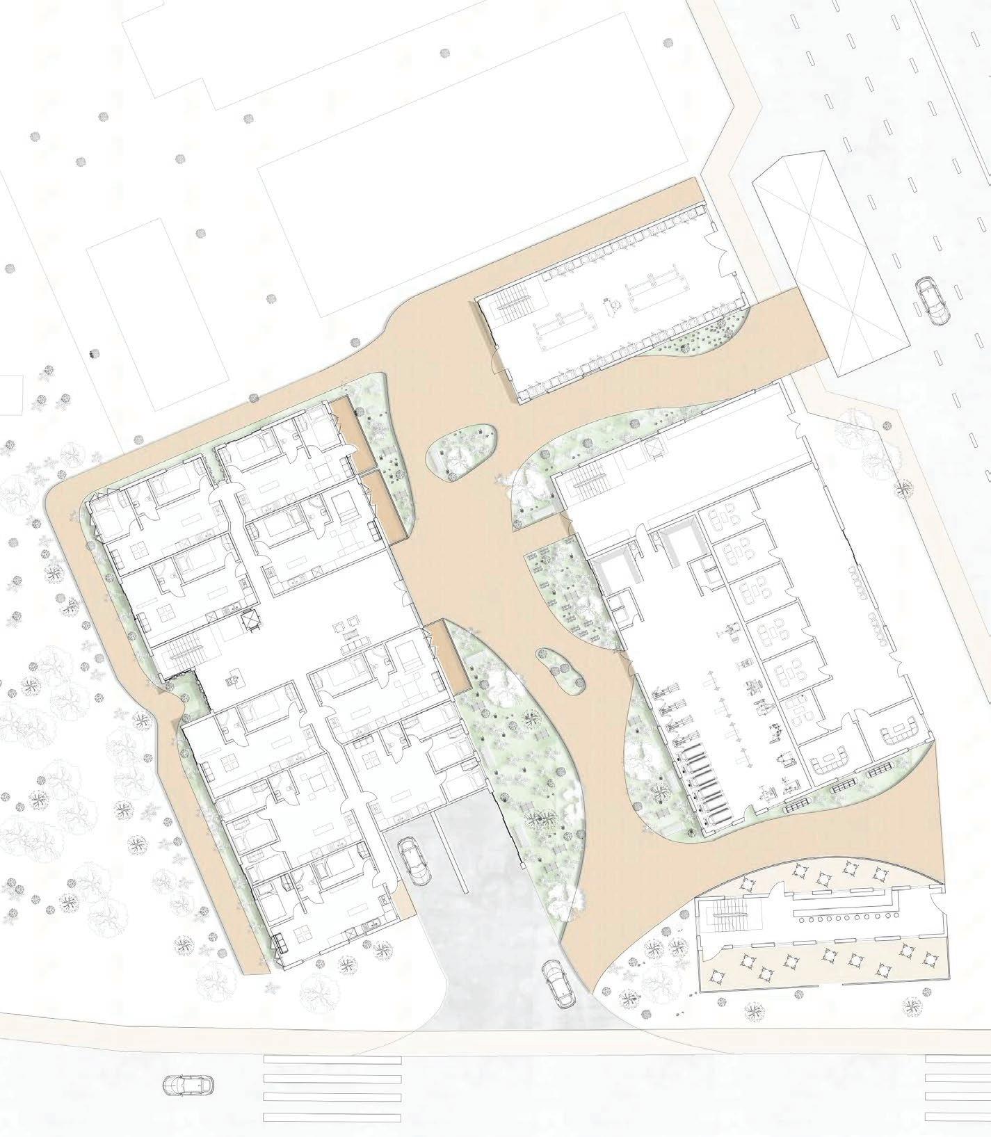 This designed for three different constituent groups in NW DC area: elderly people, small families, and young working/ studying adults. This therefore presents intergenerational relationships, with a variety of needs that are covered by unique spaces. In this design, there is a shared court yard, but there are also semi-private/public spaces as you go es, and study rooms.