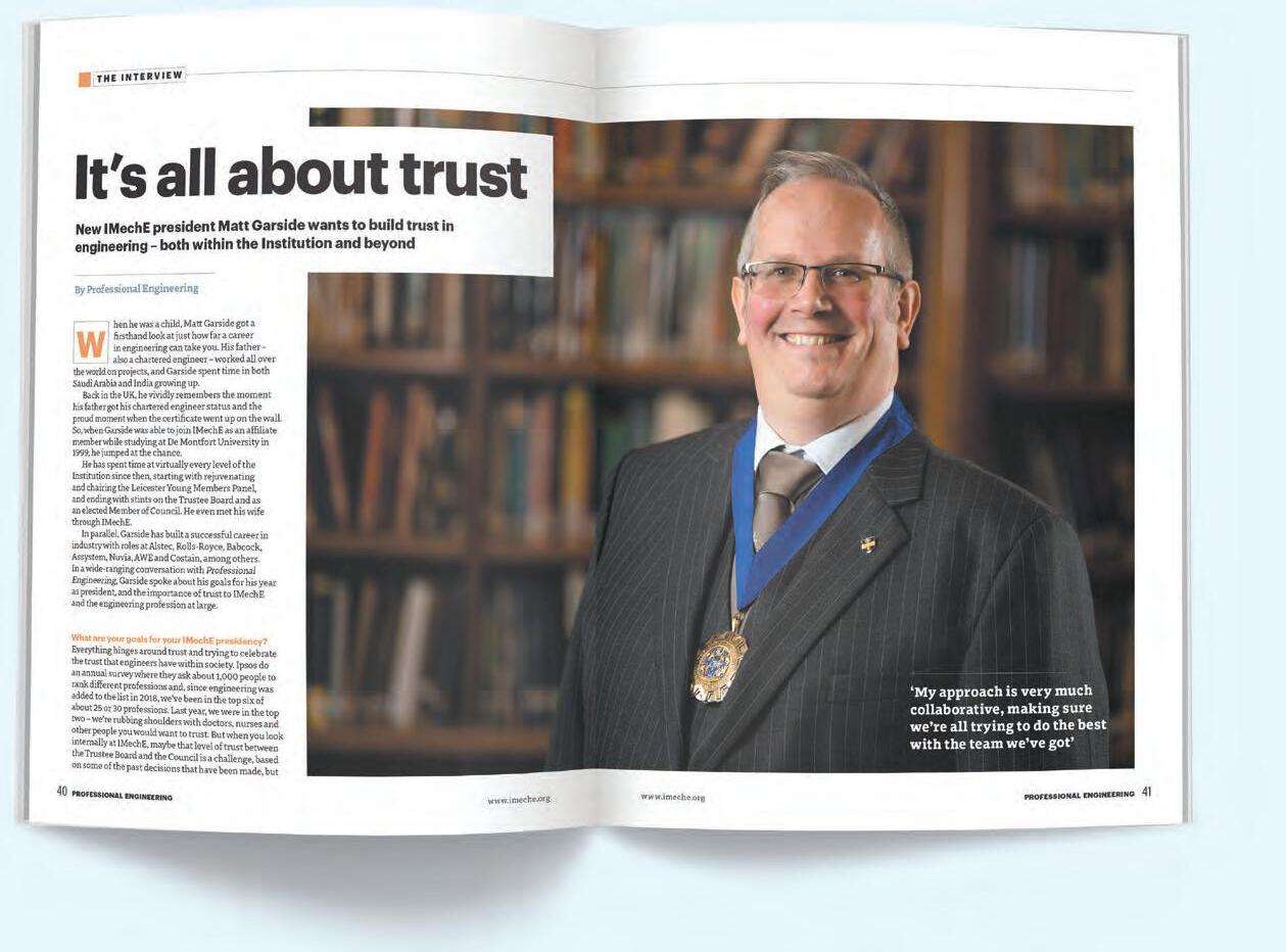 irst, a sincere thank you. My first months in post have been marked by a warm welcome from members, volunteers and staff across the Institution, and I am deeply grateful for your time, insight and encouragement. Recently, my days have been a blend of in-person and online meetings, ranging from Prestige Lectures to celebrations of engineering excellence, where I’ve sat alongside engineering A-listers and IMechE community glitterati. All have been humble, self-effacing and slightly nonplussed by my fascination with the societal difference that they and their colleagues make happen every day. I‘ve been especially impressed by the dedication of our volunteers. We could not do what we do without you. In every part of the Institution, volunteers are the driving force behind many of our achievements.
