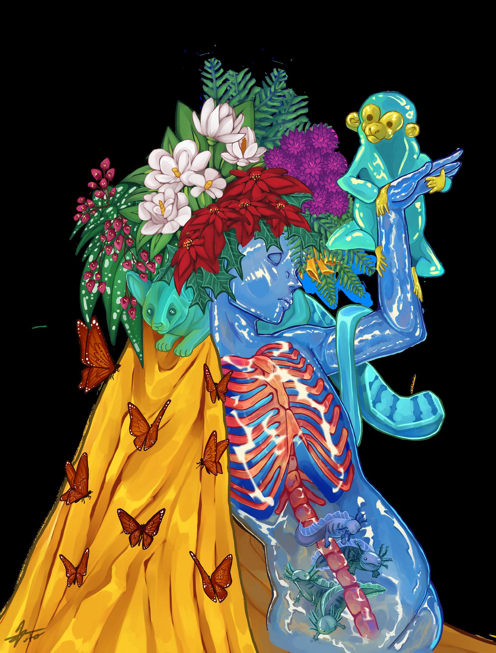 Dentro de la obra se dio gran importancia a la representación de la biodiversidad mexicana, incluyéndose así elementos naturales alrededor de toda la ilustración. Se presenta en la composición a un ser humano con piel traslúcida, similar al cristal, a quien acompañan flores nativas mexicanas como la magnolia pacífica, la nochebuena, la dalia, la flor de vainilla y la begonia tamaya; también están incluidos animalitos como una cría de mono araña, el cacomixtle, la mariposa monarca y el popular ajolote.