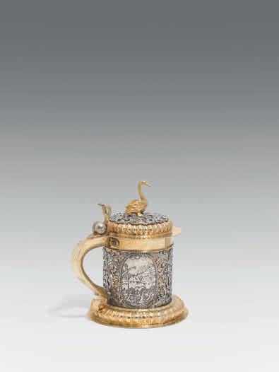 Leipzig, um 1690 Silber, teilweise vergoldet; umlaufen der Akanthusblattdekor, die Wan dung mit 3 Architekturdarstellungen; breiter und gewölbter Fuß, der Deckel mit Akanthusblattdekor und einem vollplastisch ausgeführten Schwan als Bekrönung; gemarkt: Leipziger Beschauzeichen und verschlagene Meistermarke wohl für Johann Paul Schmidt (siehe: Rosenberg II, Nr. 3066); H. 21 cm; 1.046 g