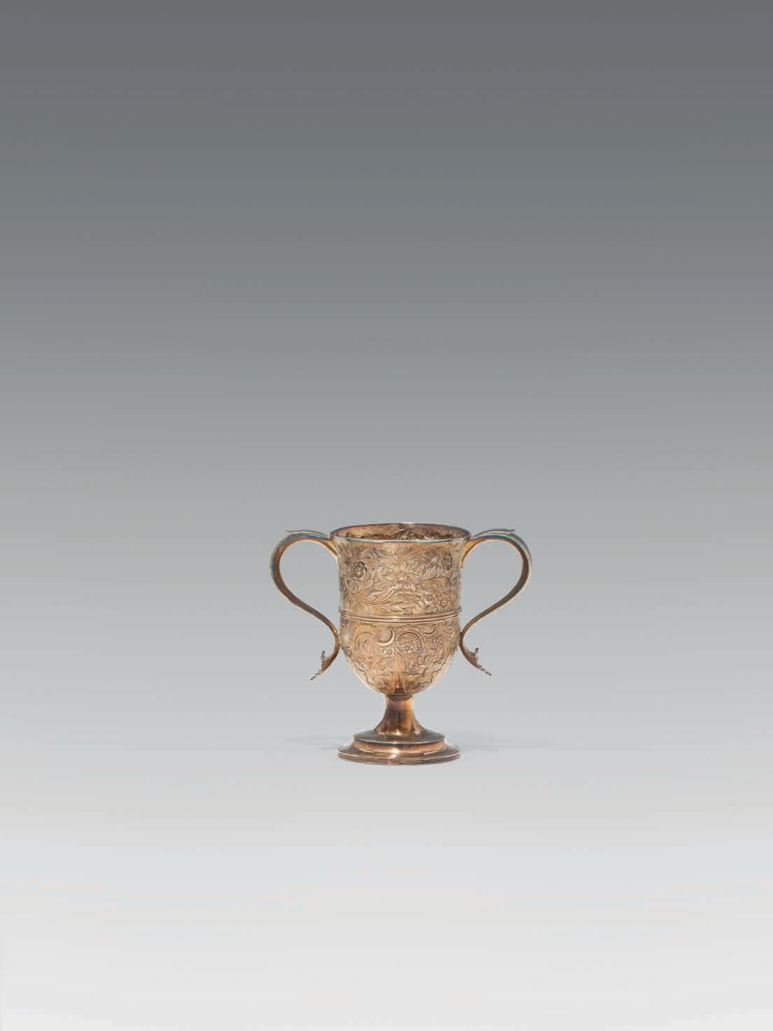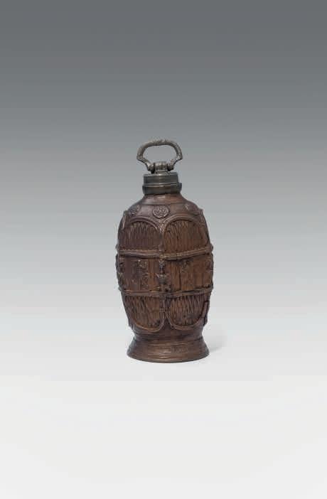 Silber, vergoldet; Wandung mit Rocaillen-, Ranken- und Vogeldekor, plastisch ausgeformter figürlicher Knauf; seitlich und auf der Unterseite gemarkt: Augsburger Beschauzeichen, Tremolierstich, Meistermarke „CP“ für Christoph Prunnenmair (Meister 1610, verstorben 1617) (siehe: Seling, die Augsburger Gold- und Silberschmiede 1529–1868, S. 171), Repunze und monogrammiert „WT“; H. 13,6 cm; 409 g € 5.000–10.000