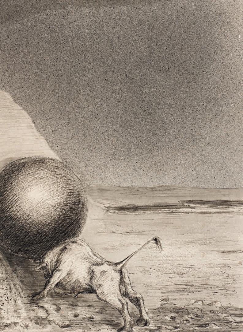 Kubins großformatige Tuschfederzeichnung „Die Arbeit“ gehört in die Gruppe seines berühmten ‚Frühwerks’ von 1899 bis 1904, das zu Recht als die wichtigste Periode seines Œuvres angesehen wird. In diesen Blättern werden phantastische, alptraumhafte Szenerien manifest, die wie Einblicke in die moderne Seele mit ihren Angstkomplexen und Trieben wirken und bei den Zeitgenossen mit ihren nie zuvor gesehenen Bildmotiven Aufsehen und Empörung auslösten. Neben den zahlreichen Werken mit erotischen, oft drastischen Zwangsvorstellungen von Verführung und Verderben ist ein beherrschendes Leitmotiv die Thematik von Macht, Ohnmacht und Ausgeliefertsein. Deren Abhängigkeit von einem massiven, vieldiskutierten VaterKomplex Kubins mildert nicht die Wirkung seiner Visionen von atavistischen Götzen voll rätselhafter, oft todbringender Schrecken, sondern traf im Gegenteil auch mit seiner Kritik einen Nerv der Zeit. In der monumentalen Machtfigur von „Die Arbeit“, an der sich ein proportional kleiner Stier trotz seiner Kraft mit einer übergroßen Kugel auf seinem Nacken wie Sisyphos abarbeitet, sind auch stilistisch alle Elemente von Kubins ‚klassischem’ Frühwerk enthalten: Die sorgfältige Durchführung der Zeichnung mit ihren eigentümlichen, eindringlichen Härten des Strichs und die Hell-Dunkelwirkung, die Kubin durch eine charakteristische Spritztechnik mit durch ein Sieb geriebener Tusche für einen diffus entgrenzten Raum erreichte, sowie die exakt gezogene Einfassungslinie, die seinen Zeichnungen die Bedeutung abgeschlossener Kompositionen gibt. Zudem ist in „Die Arbeit“ die mächtige Symbolfigur in der linken Bildhälfte als steinerne Pyramide mit Pharao-Kopf, kultischem Hoheitszeichen und teilnahmslosem Blick in einer öden, gleichsam vorgeschichtlichen Landschaft ebenso typisch für Kubins Inszenierungen von Übermacht wie die Untersicht, die sich auch in vielen anderen, eher erotisch konnotierten Blättern wie „Adoration“ oder „Der Götze“ zeigt.