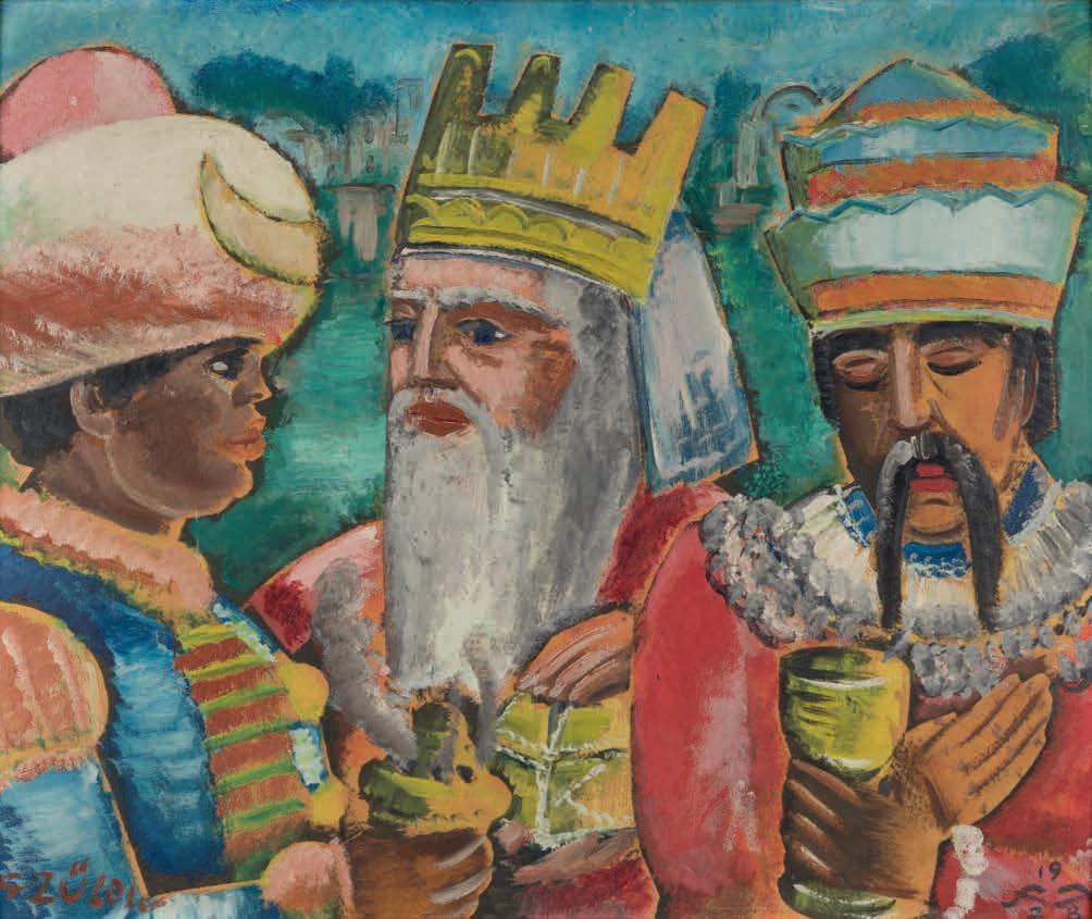 Zeit seines Lebens hat sich Alfons Walde mit der Figur des Bauern beschäftigt, war doch Kitzbühel ein bäuerlich geprägter Ort. Eingebunden in seinen Landschafts- und Lebensraum hat er sich dem Typus des Bauern in vielfältigen Bildvarianten gewidmet. Vorliegendes Bild ist eine sehr frühe, 1912 entstandene Fassung des Themas „Sonntag“. In engem Bildausschnitt sind drei Männer in typischer Festtagstracht dargestellt, die ihr Gespräch unterbrochen haben und sich den beiden in einiger Entfernung vorbeigehenden Frauen zuwenden. Der Maler legt den Fokus der Milieuschilderung auf die Figuren als archetypische Repräsentanten der „Begegnung“ am Sonntag und verzichtet auf schmückendes Beiwerk und die Andeutung eines Hintergrunds. Starke Hell-Dunkel-Kontraste, stilisierte Formen und die Reduktion auf das Wesentliche werden auch in späteren Schaffensjahren zentrale Elemente der künstlerischen Ausdruckskraft von Alfons Walde sein.