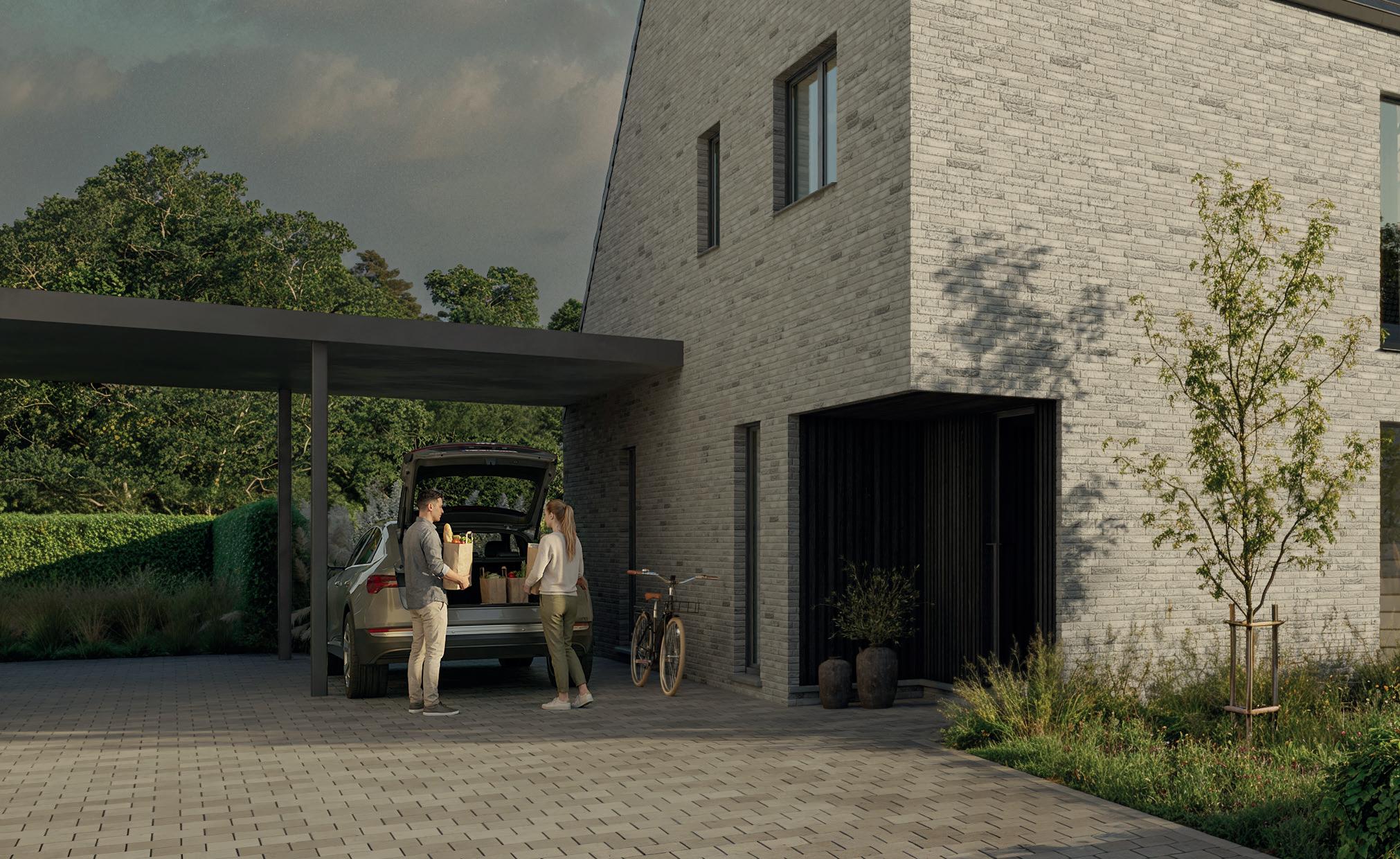 • Opritten, paadjes en terrassen in waterdoorlatende betonklinkers (arduin)grijs, formaat 20/20 tussen boordstenen.