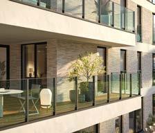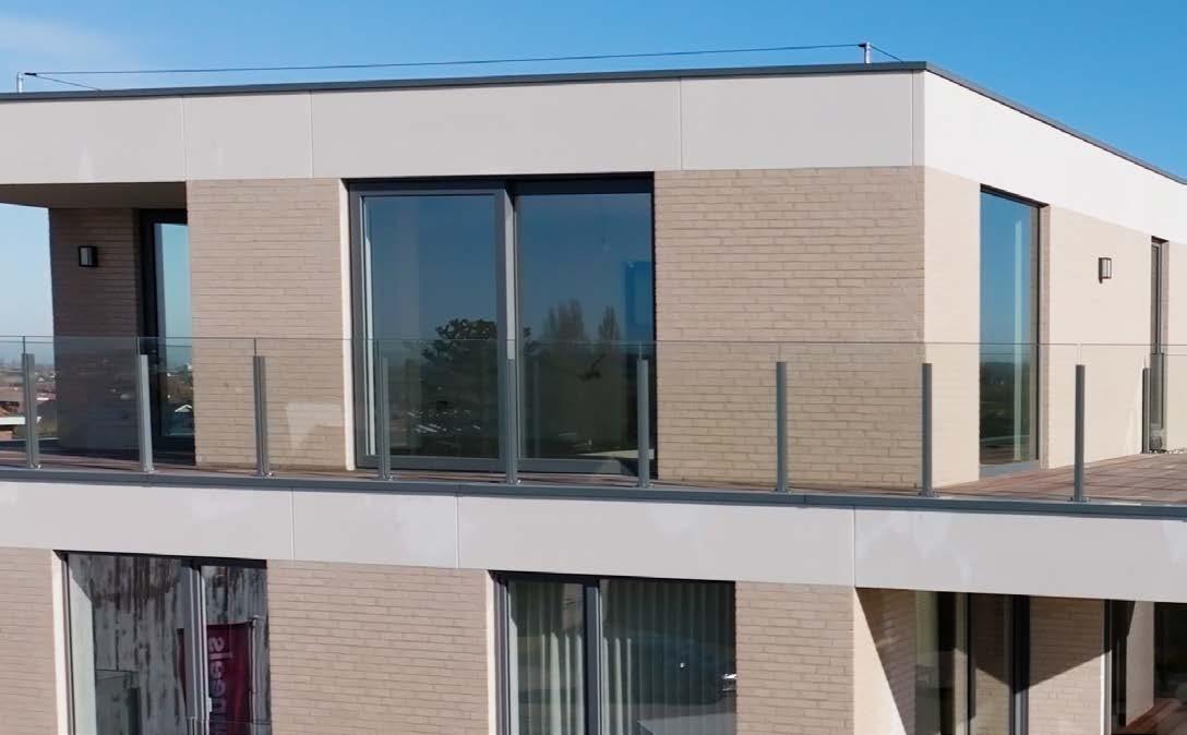 • Balustrades in ombergrijs (of benaderend) gelakt aluminium met glasvulling aan terrassen verdiepingen.