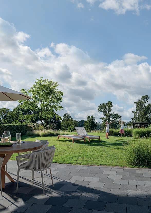 • Opritten, paadjes en terrassen in waterdoorlatende genuanceerde betonklinkers, formaat 20/20 tussen boordstenen.
