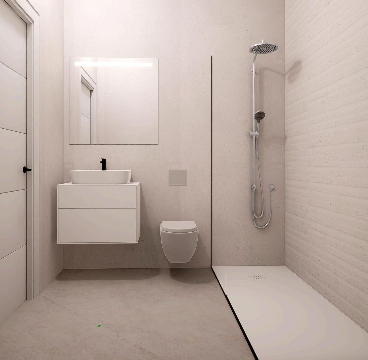 The walls of both the main and secondary bathrooms will be covered with ceramic tiles, combined with porcelain stoneware flooring.