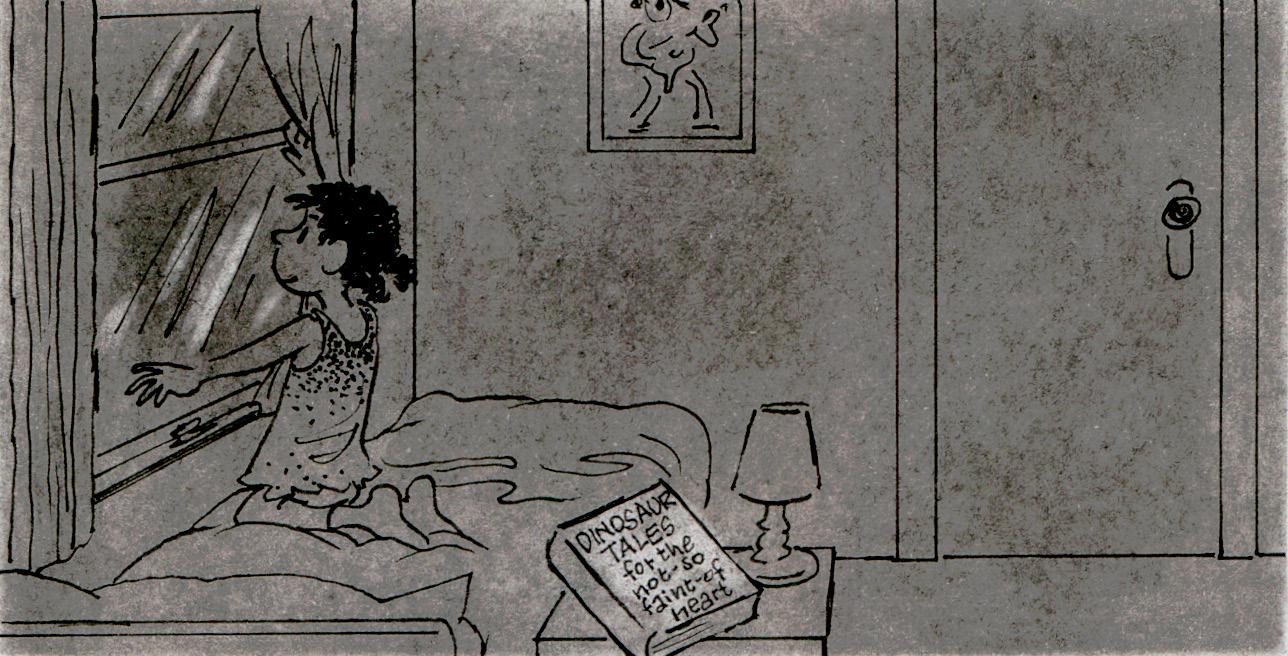 Slowly, she opens the window. This scares the dragon and it takes off, wings flapping, into the night.