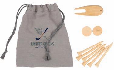The Bamboo Golf Tee Set with Recycled Pouch is the perfect gift for golf events! This eco-friendly set includes six bamboo tees (measuring 2.75”), a durable divot tool, and two ball markers, all secured in a convenient recycled PET drawstring pouch. This set not only meets your on-course needs but also supports environmental nonprofits through a partnership with 1% For The Planet. For details, please visit www.psnca.com