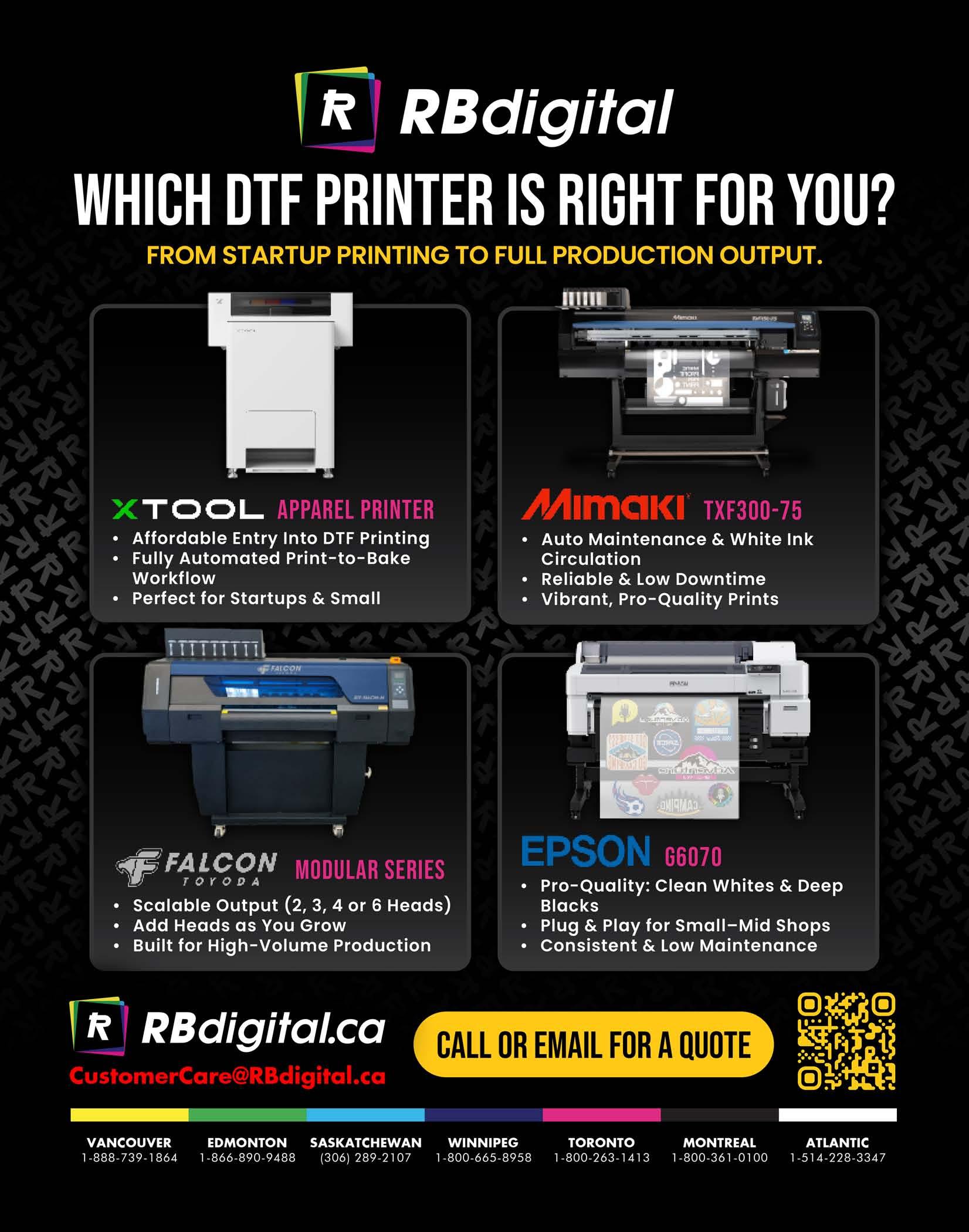 When the DTF revolution began, we saw printers that were pouring out of China all utilizing CMYKW ink con guration and the same dual Epson printhead con guration. is meant di erentiation from one supplier to another was largely down to the printer skillset.