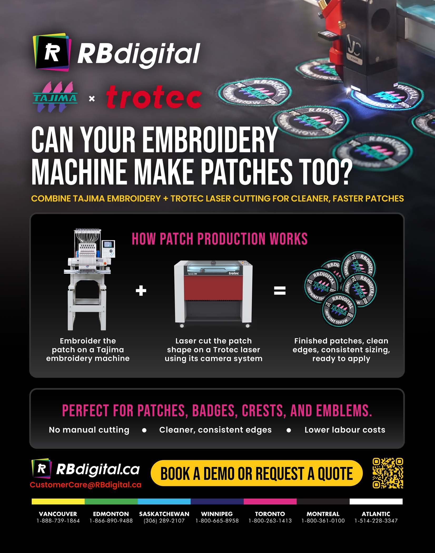 RB Digital is proud to be the exclusive Canadian distributor of Trotec Laser. The Speedy Series delivers unmatched precision and clean-edge performance, making it ideal for cutting embroidered patches with speed and accuracy. Achieve crisp borders, intricate detail, and consistent results that elevate patch production and streamline your finishing workflow.