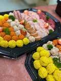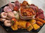 g g j opgevulde perzik met tonijn Vlees: boerenpaté gekookte ham met asperge, rauwe ham, gebakken roti & rosbief, kippenwit, frikandon, gebakken kippenboutje en mosterdspek. Inclusief groenteassortiment pasta & aardappelsalade 3 sausjes en 2 broodjes p p Groenteassortiment: wortelen, gemengde salade, tomaat, komkommer bloemkool €28,00/p p p hoofdvlees, hesp eigen werk, droge worst, grillworst, bloedworst, witte pens gekookt