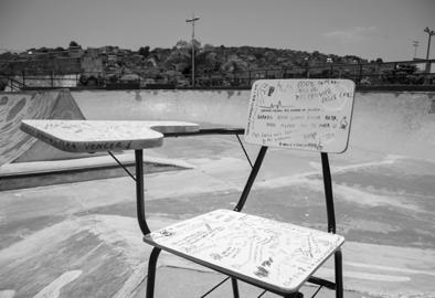 diretamente pelas pessoas entrevistadas, que também participaram do ensaio, entre tantas outras camadas, que ainda estão a desabrochar. Devido à dificuldade de acesso a um ambiente escolar para a realização das fotos, me vi desafiado a criar a representação da escola a partir de elementos que, em sua estética, trouxessem a reflexão sobre o espaço escolar. Foi aí que procurei soluções inspiradas no trabalho artístico desenvolvido por Andréa Hygino e a maneira como ela se apropria e opera transformações nas carteiras. Trabalho que se desdobra em reflexões sobre a instituição escolar, desde a observação da disciplina que arregimenta e dociliza os corpos – que enfileira, individualiza e adestra a experiência de estudante dentro da sala de aula –, até a discussão acerca da educação pública no Brasil.
