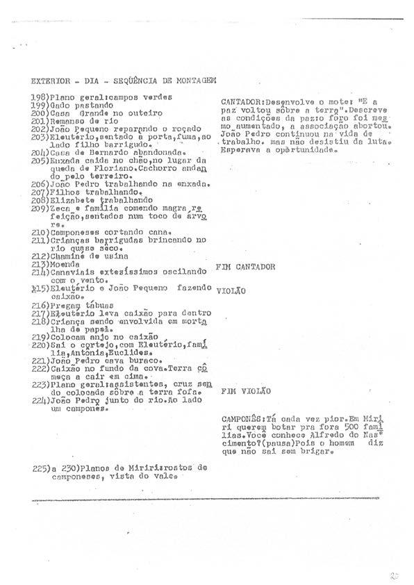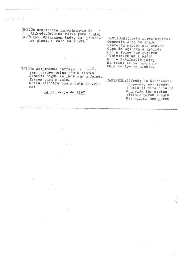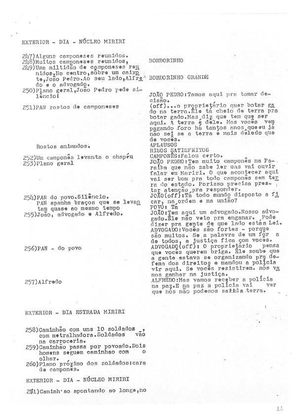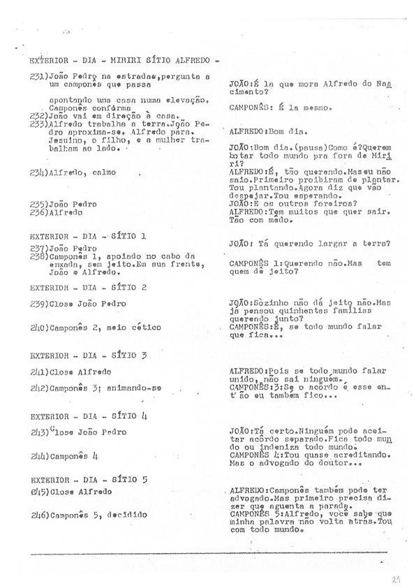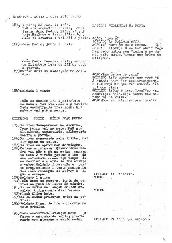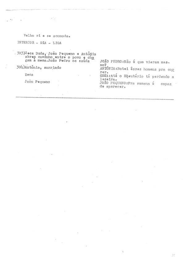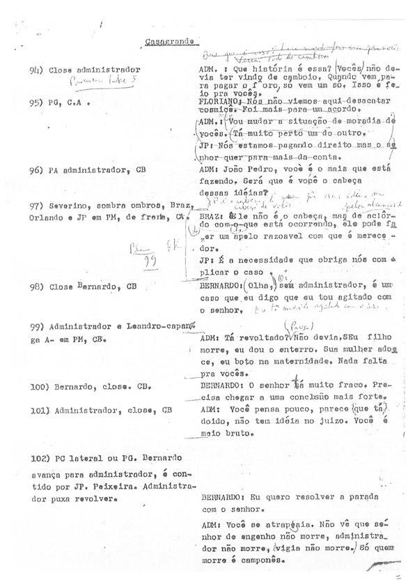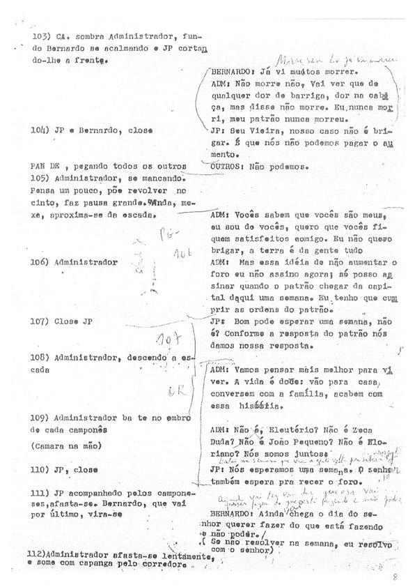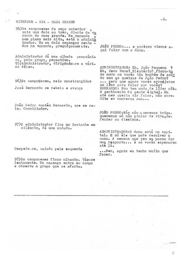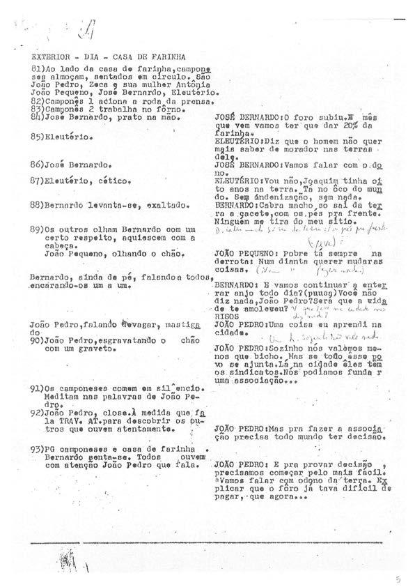 após a interrupção das filmagens e conservado atualmente no acervo do Instituto Moreira Salles. Esse roteiro foi previamente submetido a colegas do CPC , incluindo Oduvaldo Vianna Filho, que o aprovou. Nas margens, Coutinho fez anotações manuscritas, geralmente buscando ajustar o linguajar dos personagens.