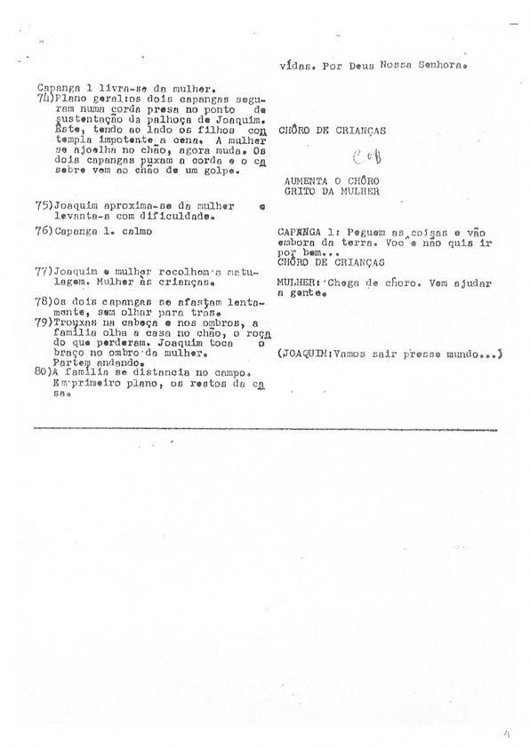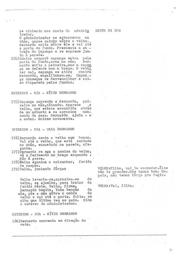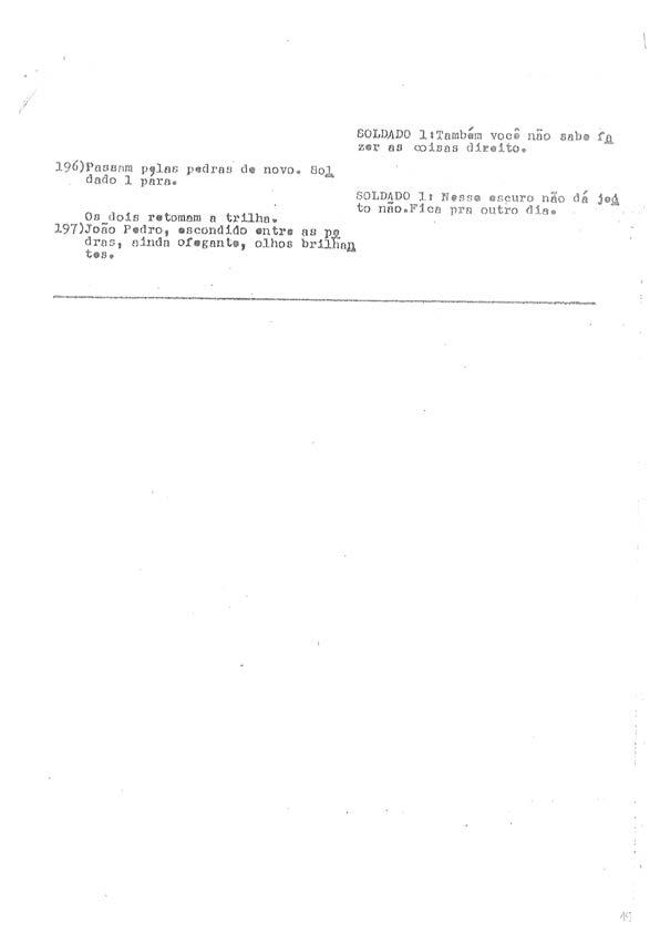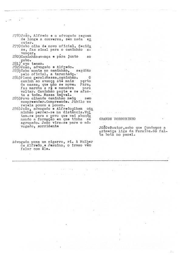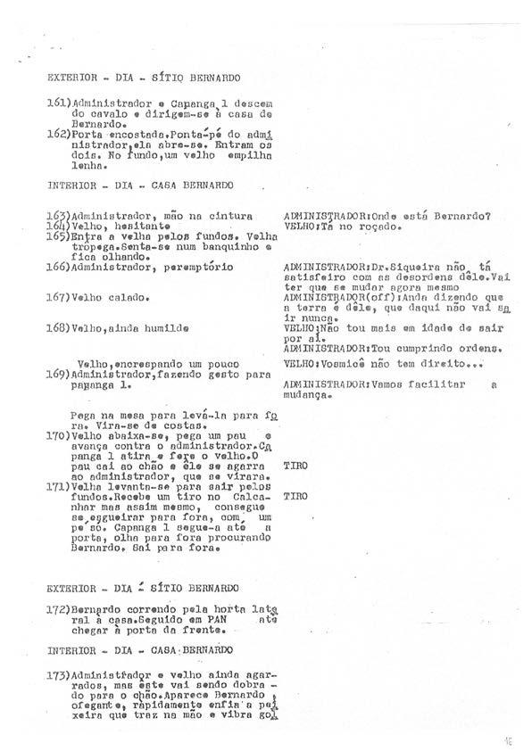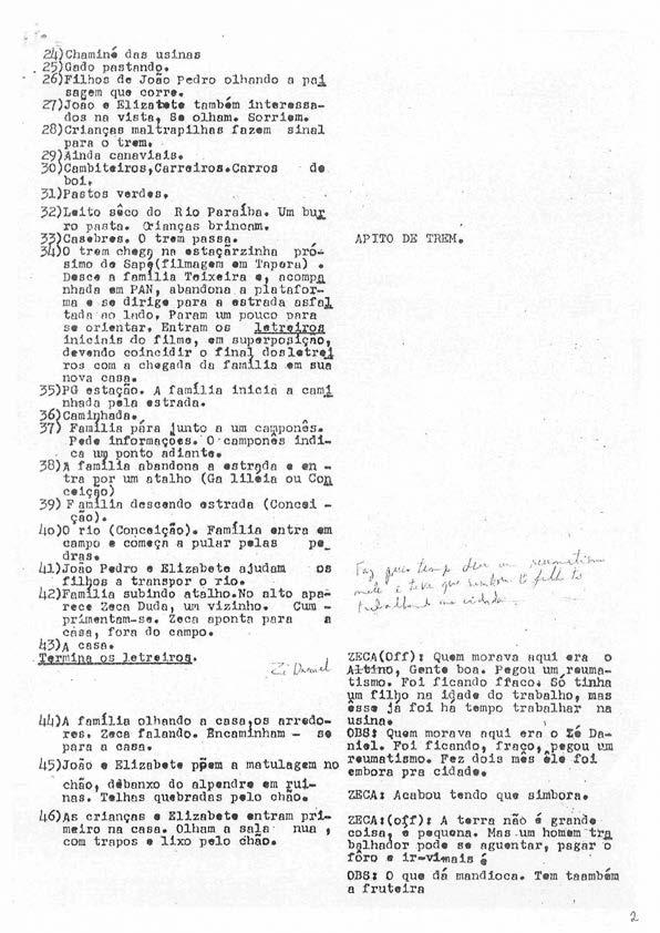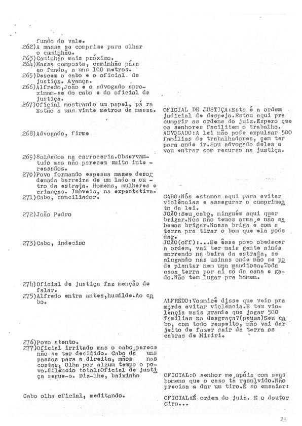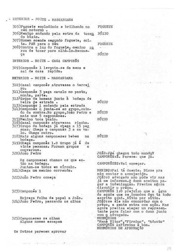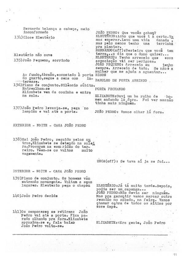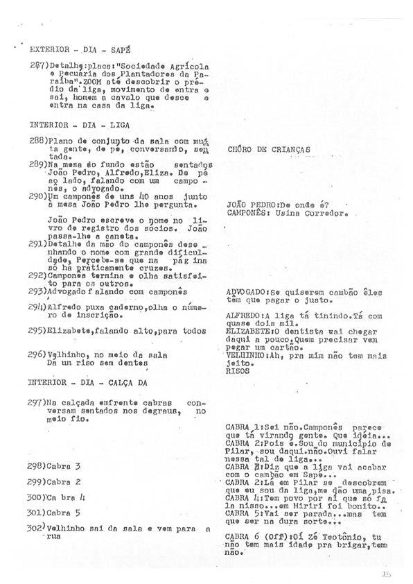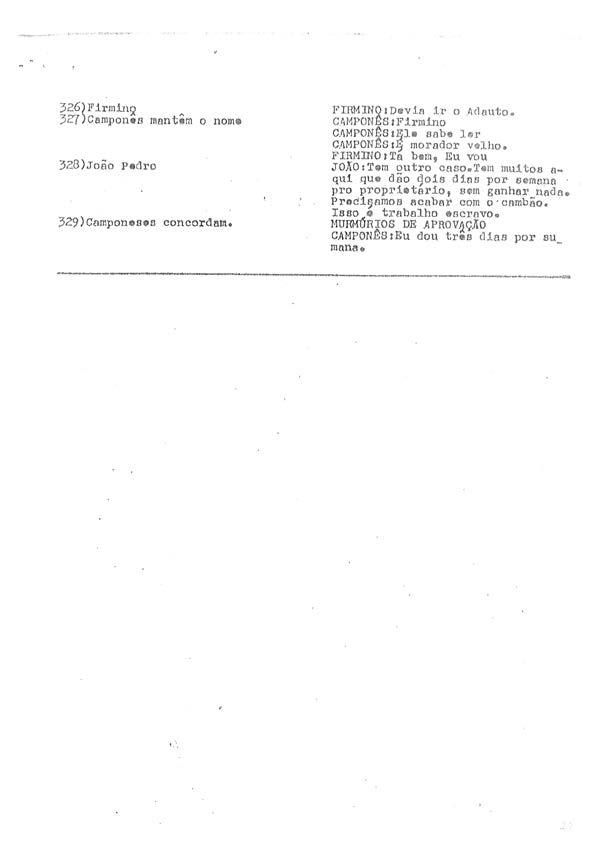 após a interrupção das filmagens e conservado atualmente no acervo do Instituto Moreira Salles. Esse roteiro foi previamente submetido a colegas do CPC , incluindo Oduvaldo Vianna Filho, que o aprovou. Nas margens, Coutinho fez anotações manuscritas, geralmente buscando ajustar o linguajar dos personagens.
