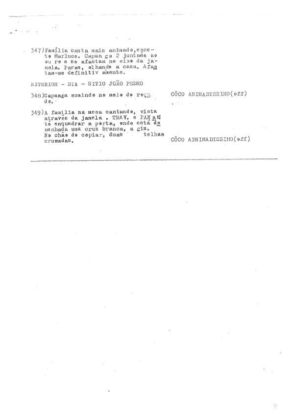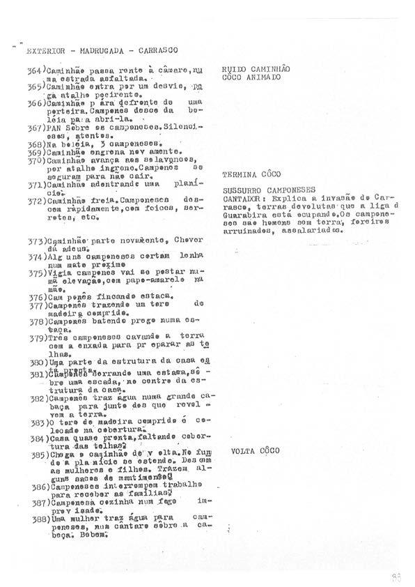 engenho, que está sendo referida na narração, como também informa sobre a prática dos retakes na produção do primeiro Cabra . No plano 94 do roteiro (um close do administrador da fazenda), Coutinho anotou à mão “Procurar take 5”, o que indica uma forma de trabalho em tudo diferente do modelo documental de take único adotado nos anos 1980.