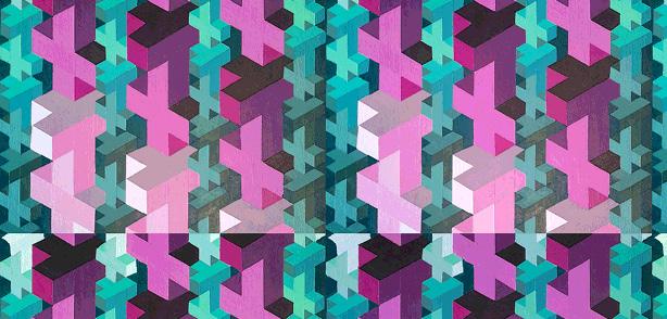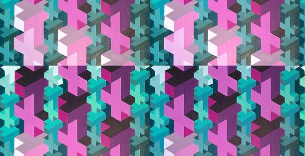This project is made from the unit piece below and hand-painted into an isometric pattern using acrylics. The piece showcases complementary colors, hues, and shading to create an illusion of dimension and structure. The hand-painted panel (top right) was digitized and transformed into a seamless pattern and an accessory using photoshop (bottom left and right).