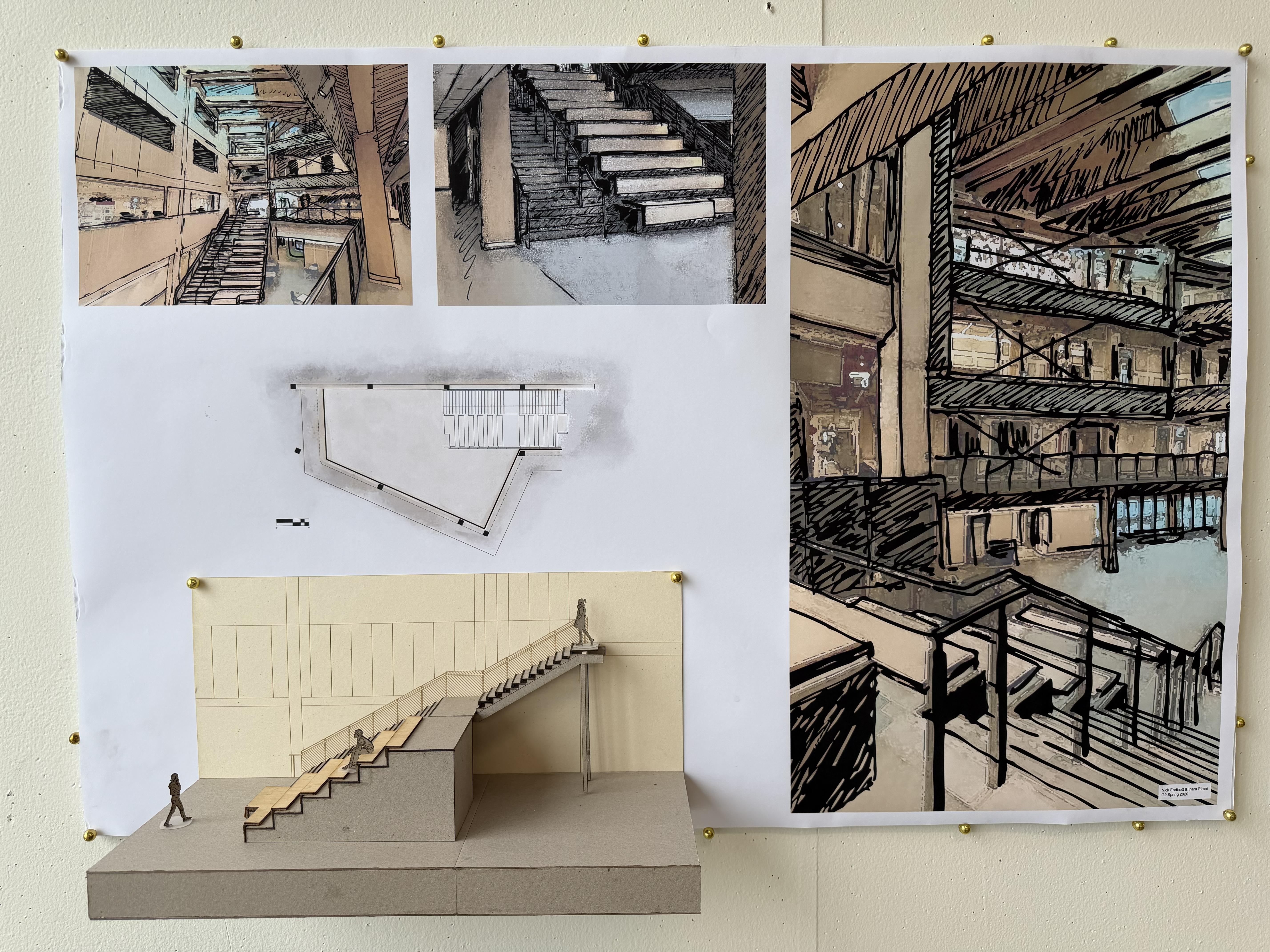 This is a case study of an existing staircase on the UMass campus, analyzed in relation to its surrounding building and spatial context. The study focused on the stair’s construction, material logic, and compliance with egress requirements. Through measured drawings, perspective representations, and a bas-relief sectional model, the project documents both the physical and spatial qualities of the stair. The purpose of the exercise was to develop an understanding of egress design and the regulations that shape stair construction in public buildings. This project was completed in collaboration with Nick Endicott.