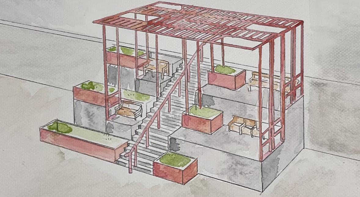 This public staircase was designed in response to a studio prompt to create a connection between Main Street and a nearby bike path in Northampton, Massachusetts. The site is located between a bridge and a restaurant called Fitzwillys. The project required an egress-compliant stair that also incorporated public seating and partial sun shading. The design responds to the site’s position between the urban character of Main Street and the more natural landscape of the bike path. Heavier stereotomic riser and seating elements are paired with lighter tectonic components, including guardrails and a pergola supported by metal columns, while planters and woodtopped benches create places for people to pause or gather along the stair.